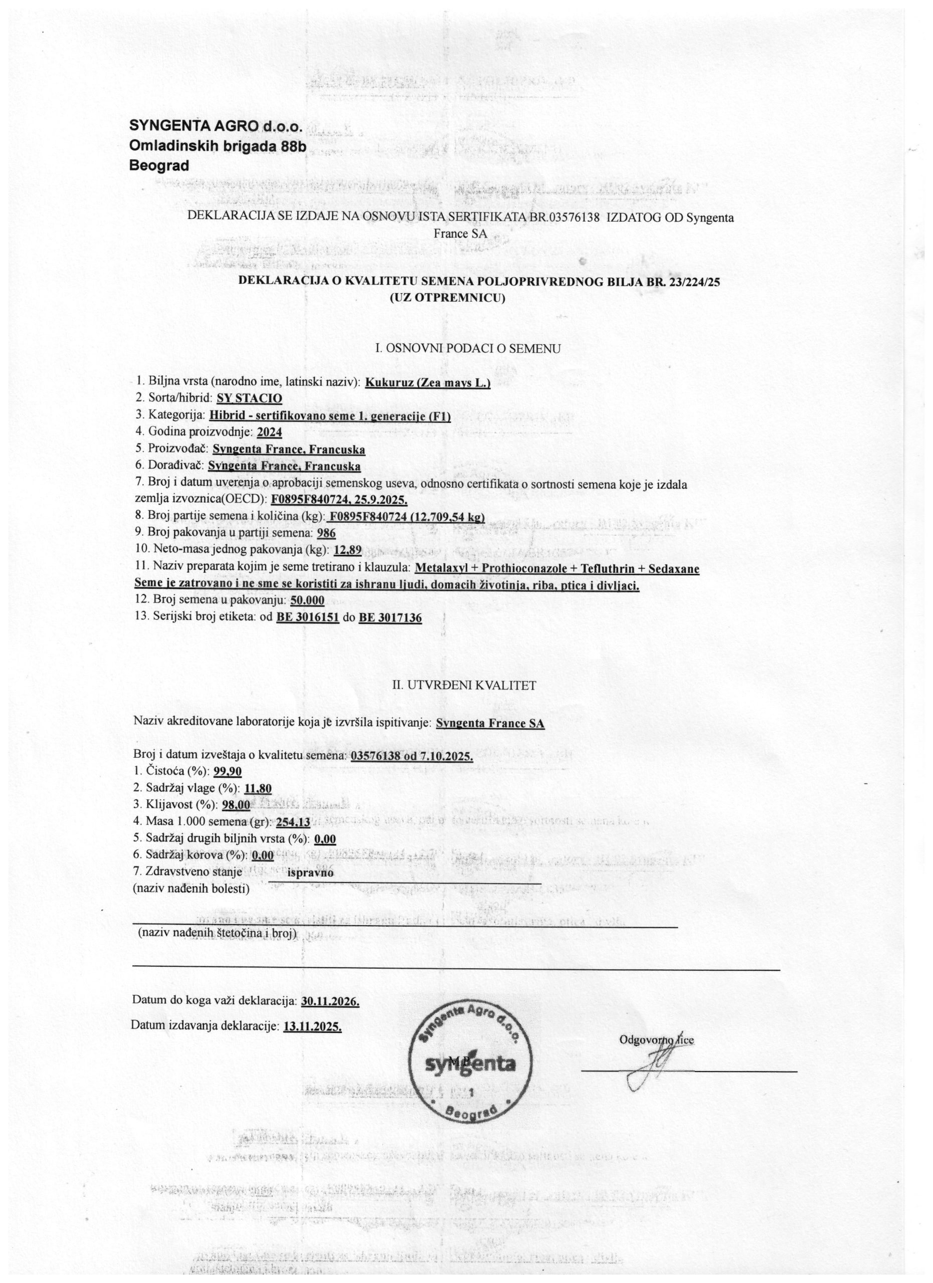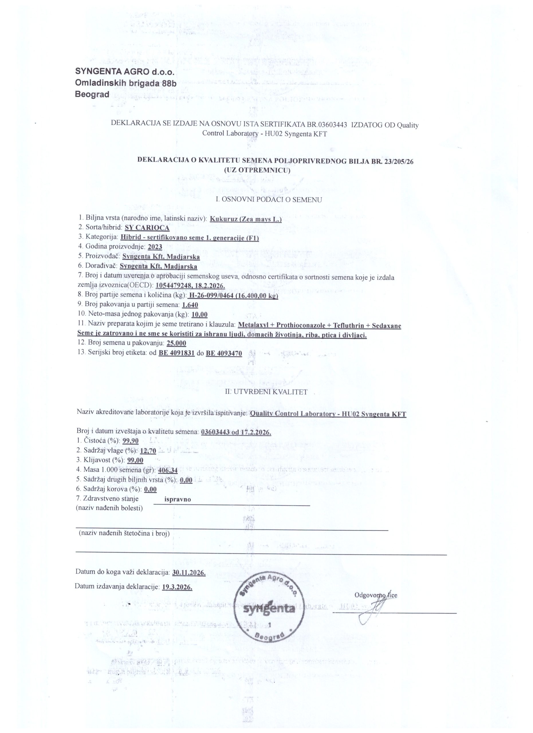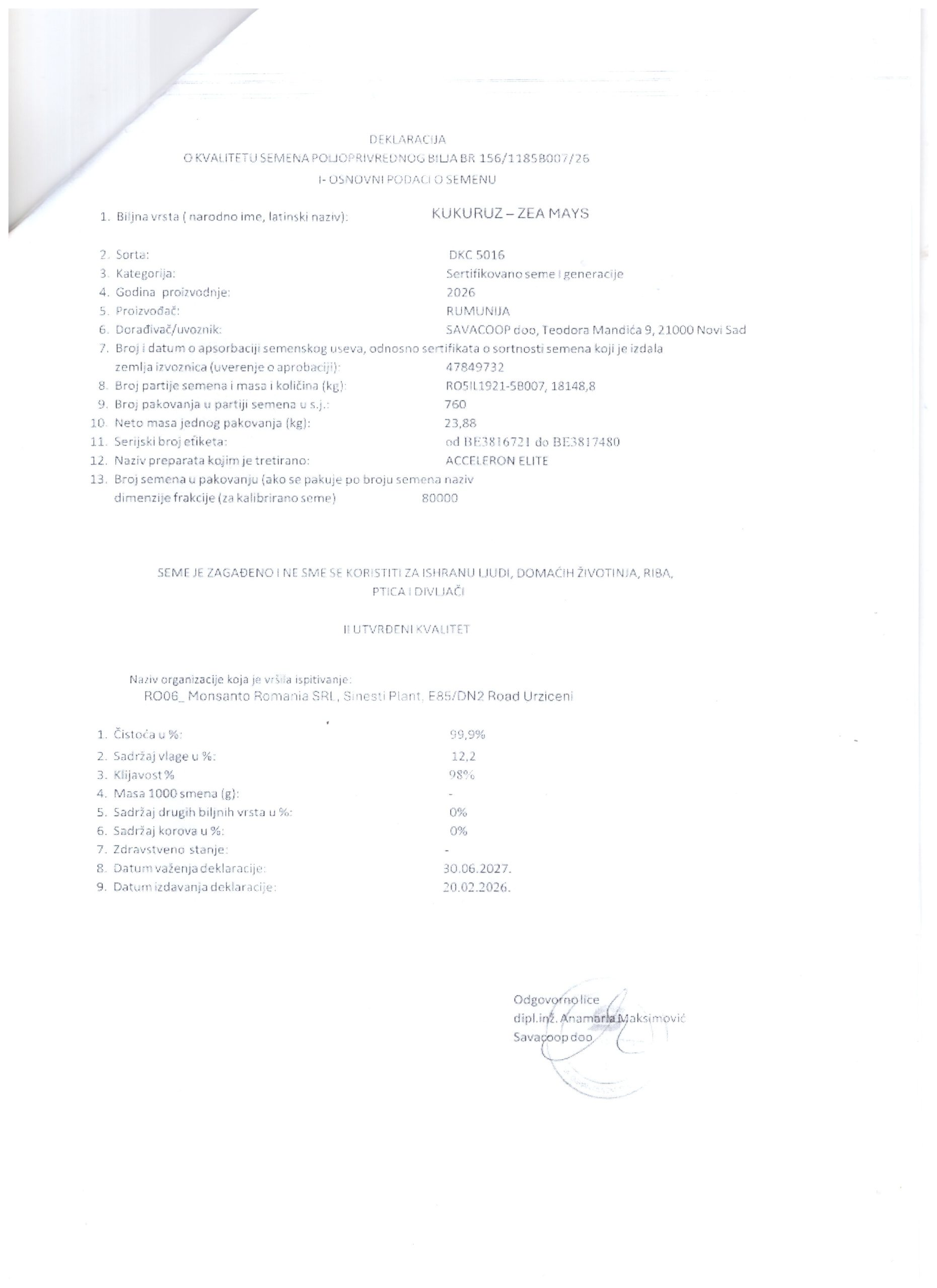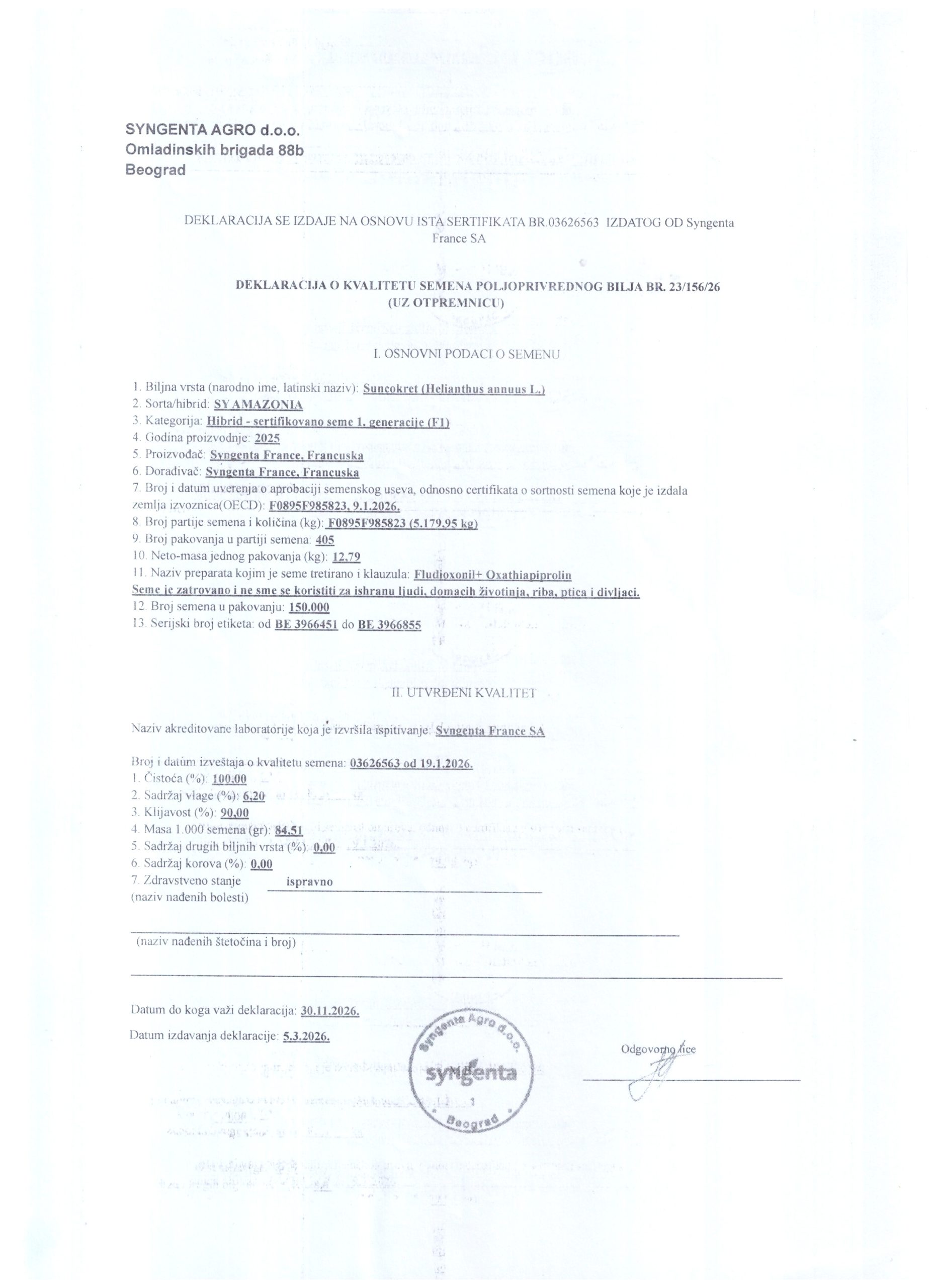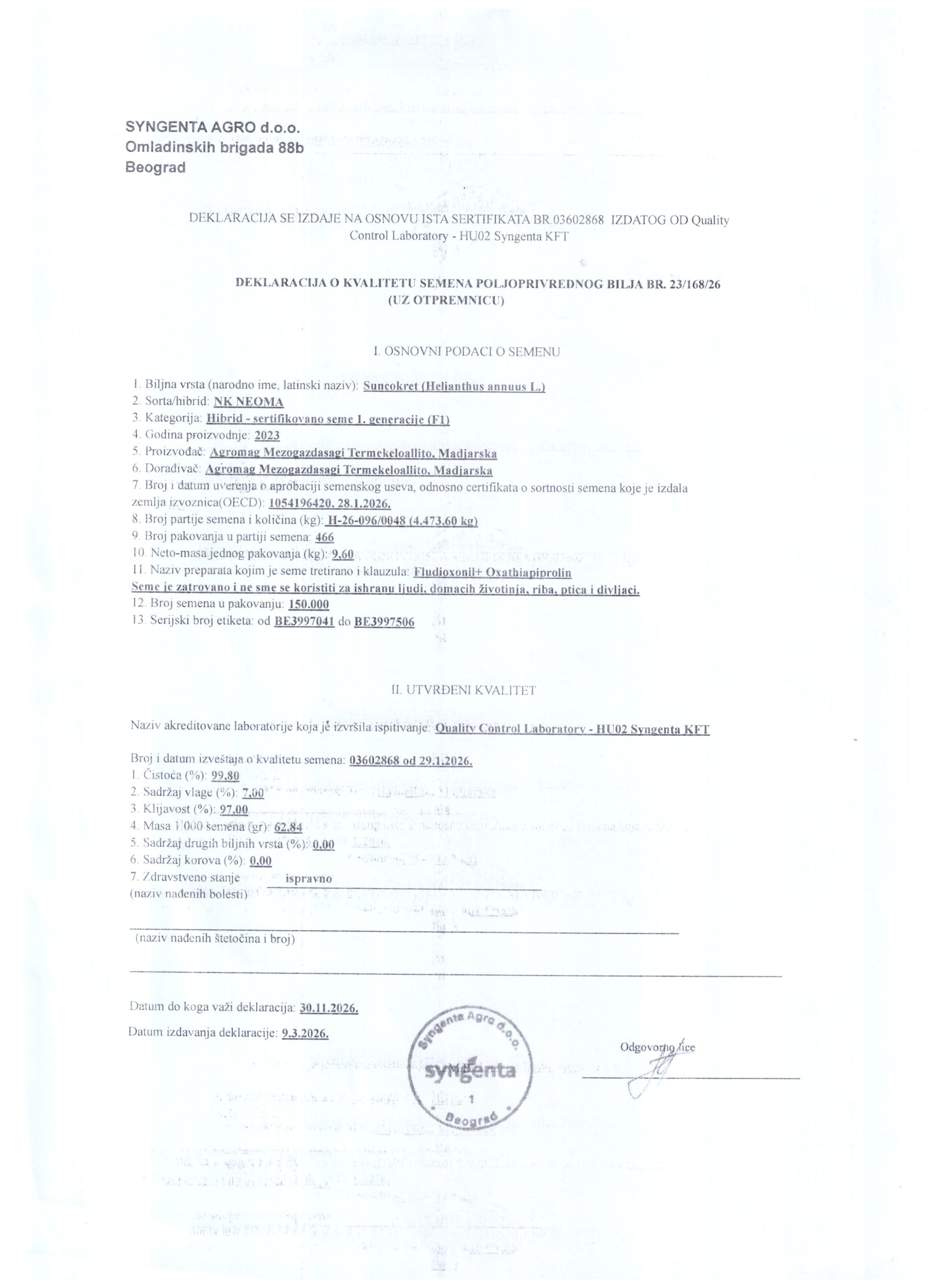 Uvoz i distribucija sredstava za zažštitu bilja kompanije NUFARM GmbH & Co KG, semena kukuruza i semena uljane repice kompanije MONSANTO INTERNATIONAL SARL.