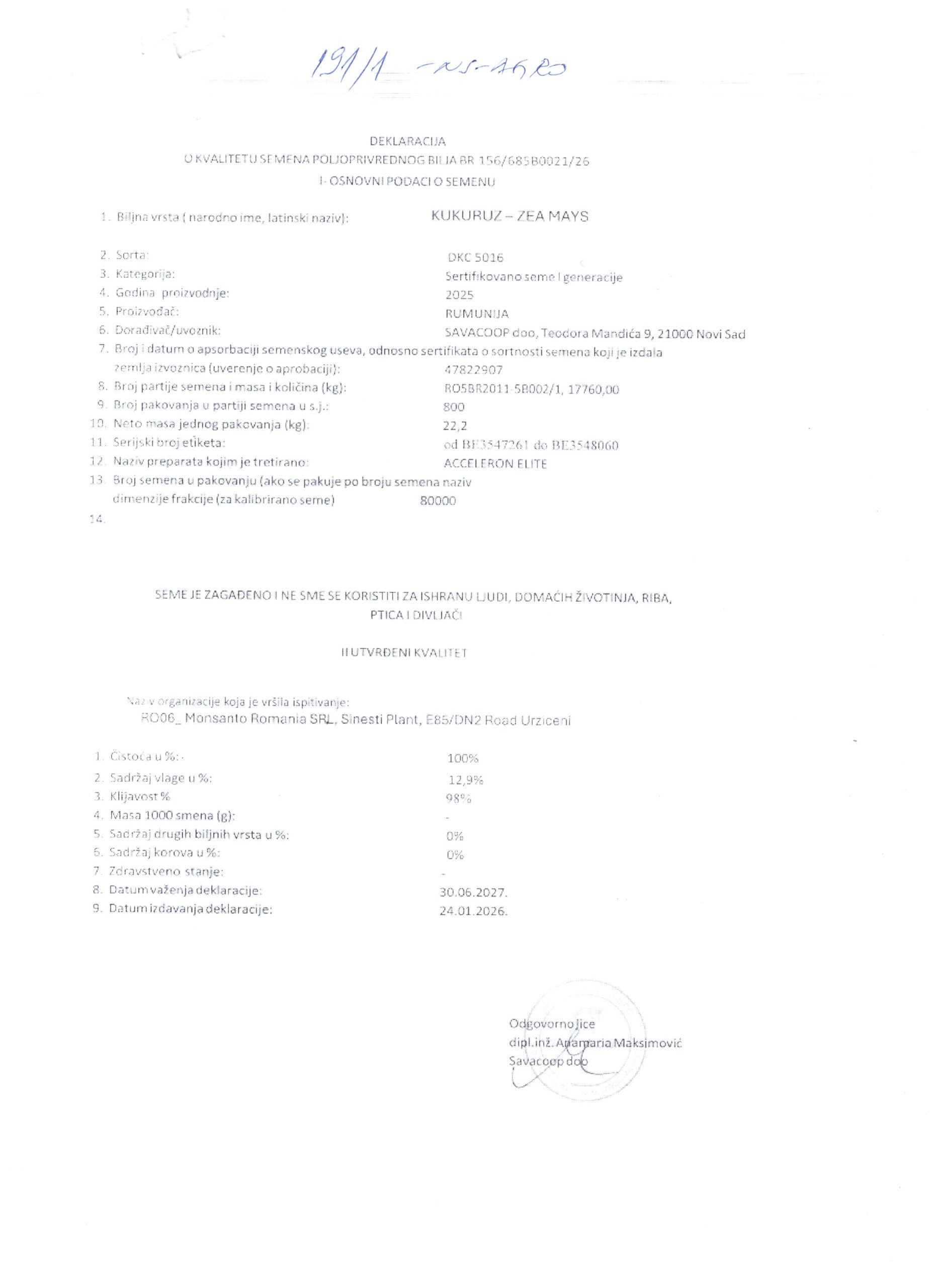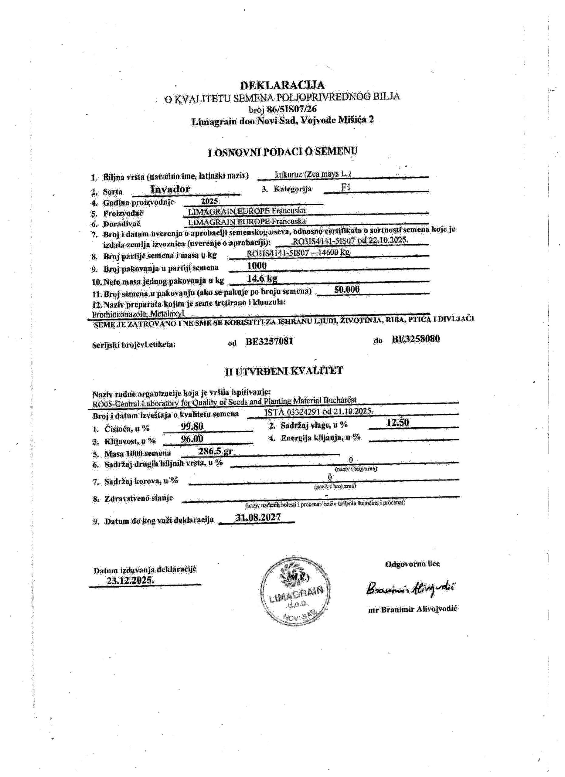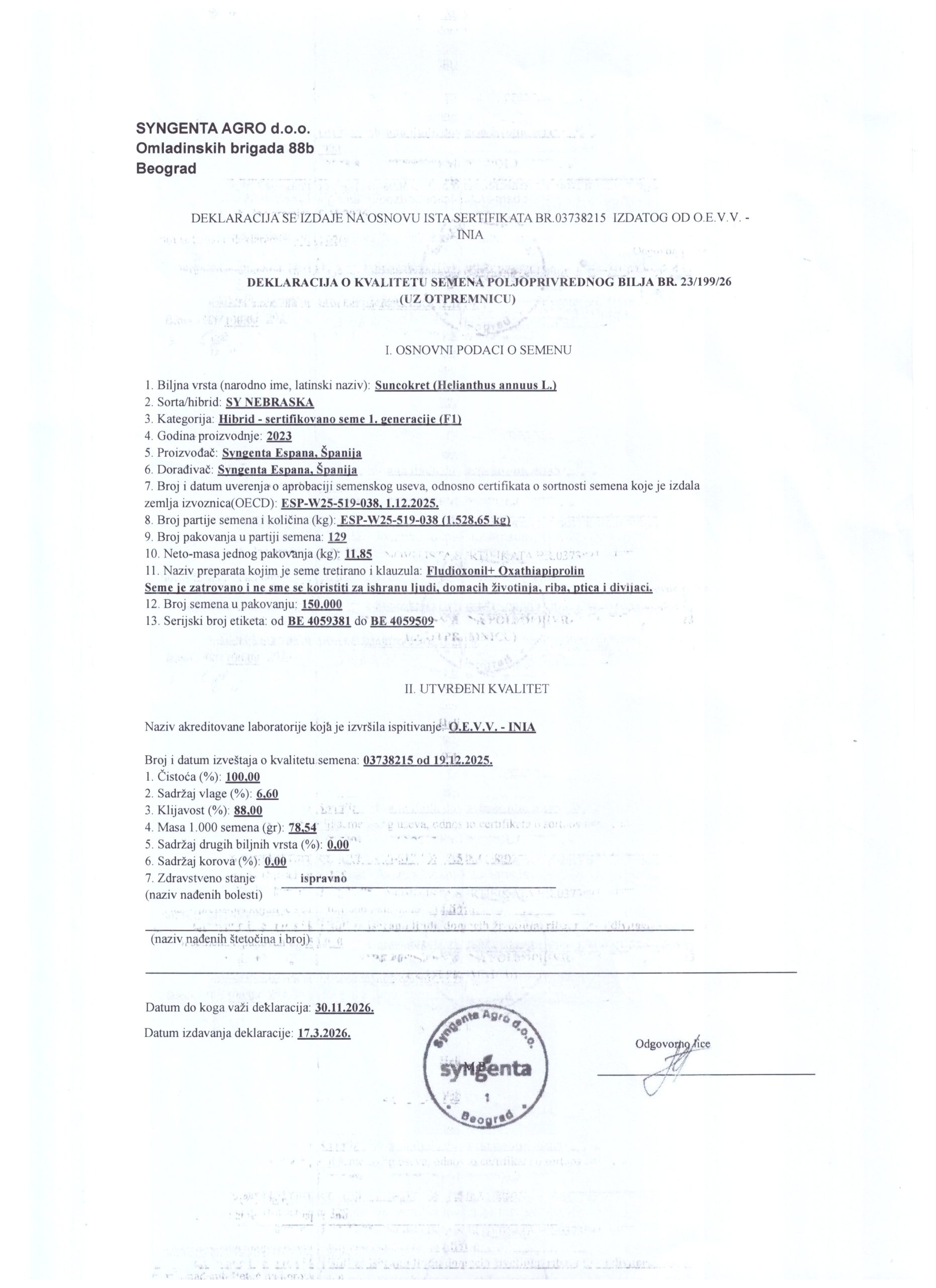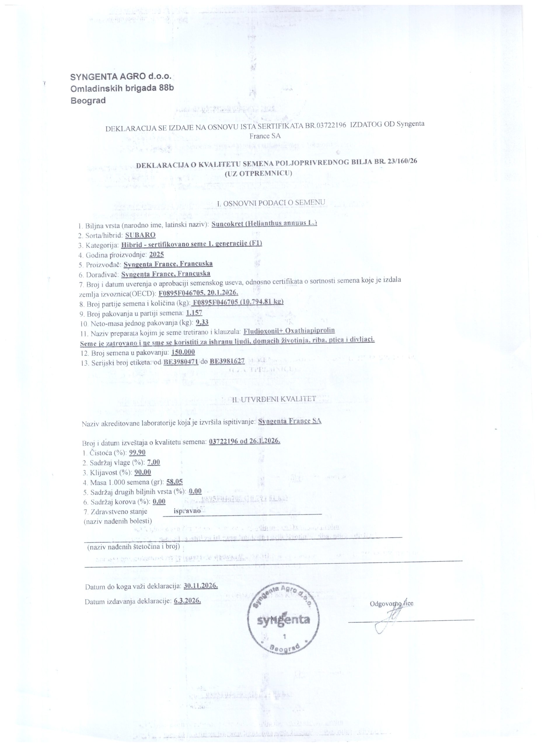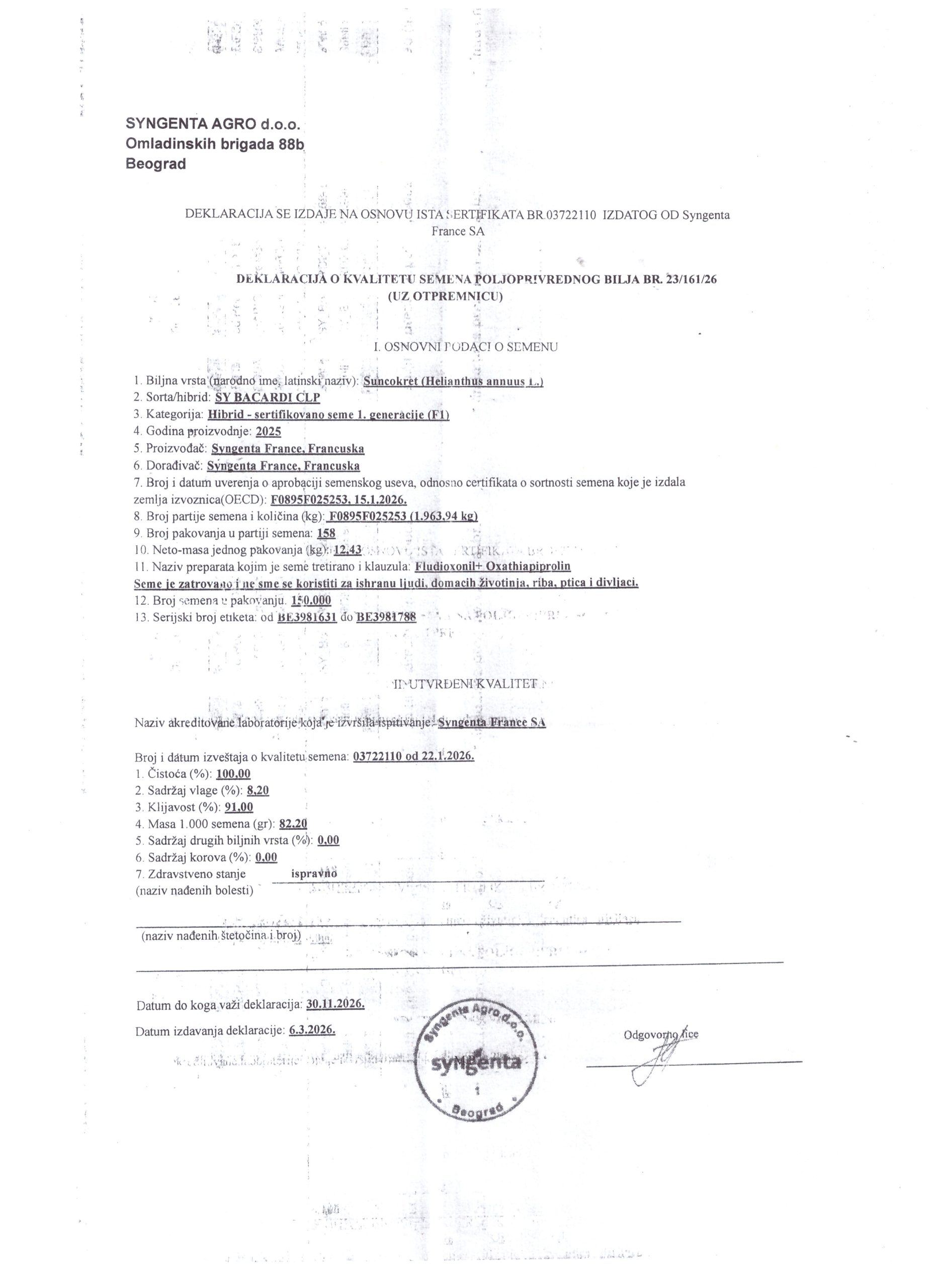 Uvoz i distribucija sredstava za zažštitu bilja kompanije NUFARM GmbH & Co KG, semena kukuruza i semena uljane repice kompanije MONSANTO INTERNATIONAL SARL.