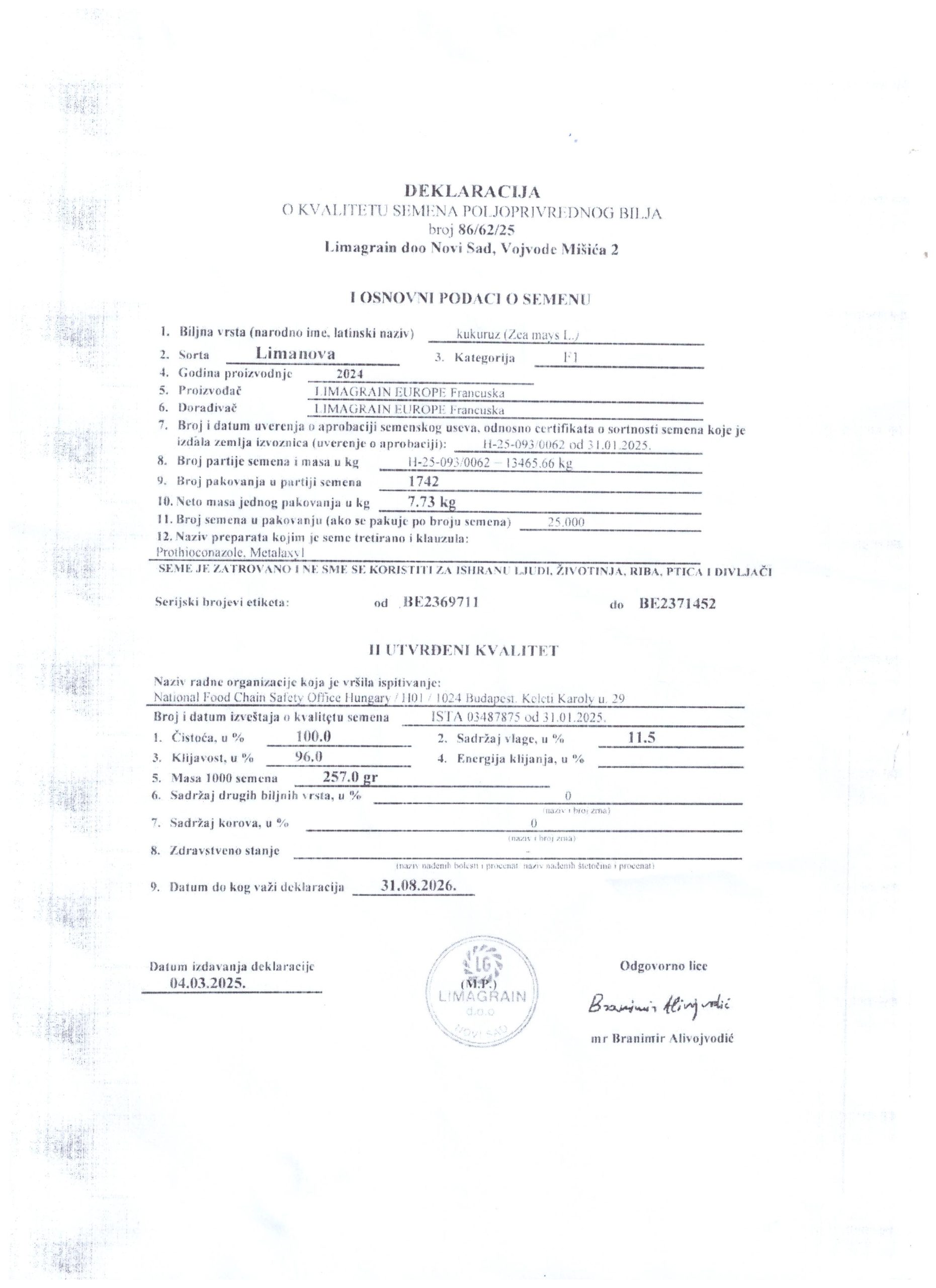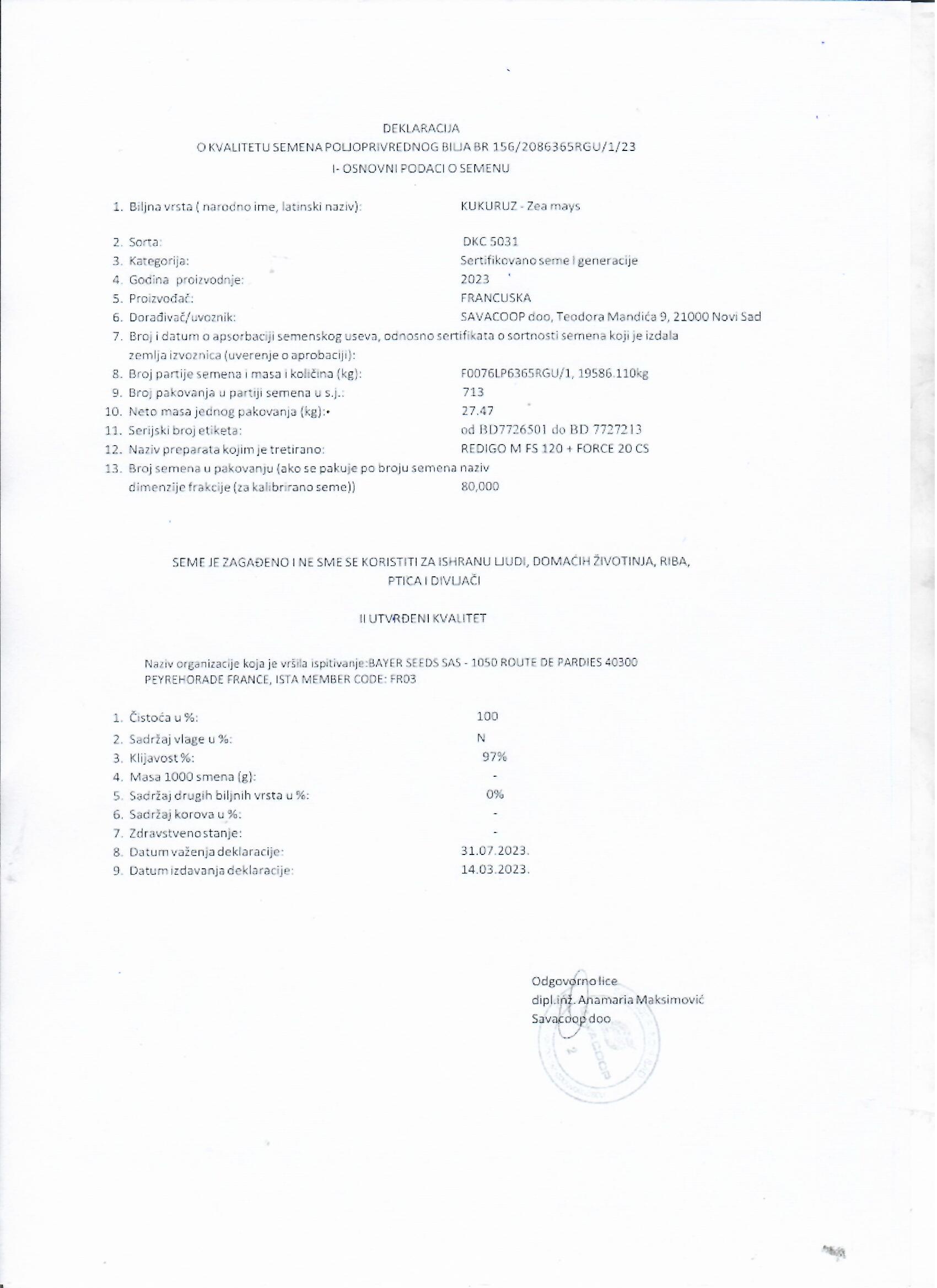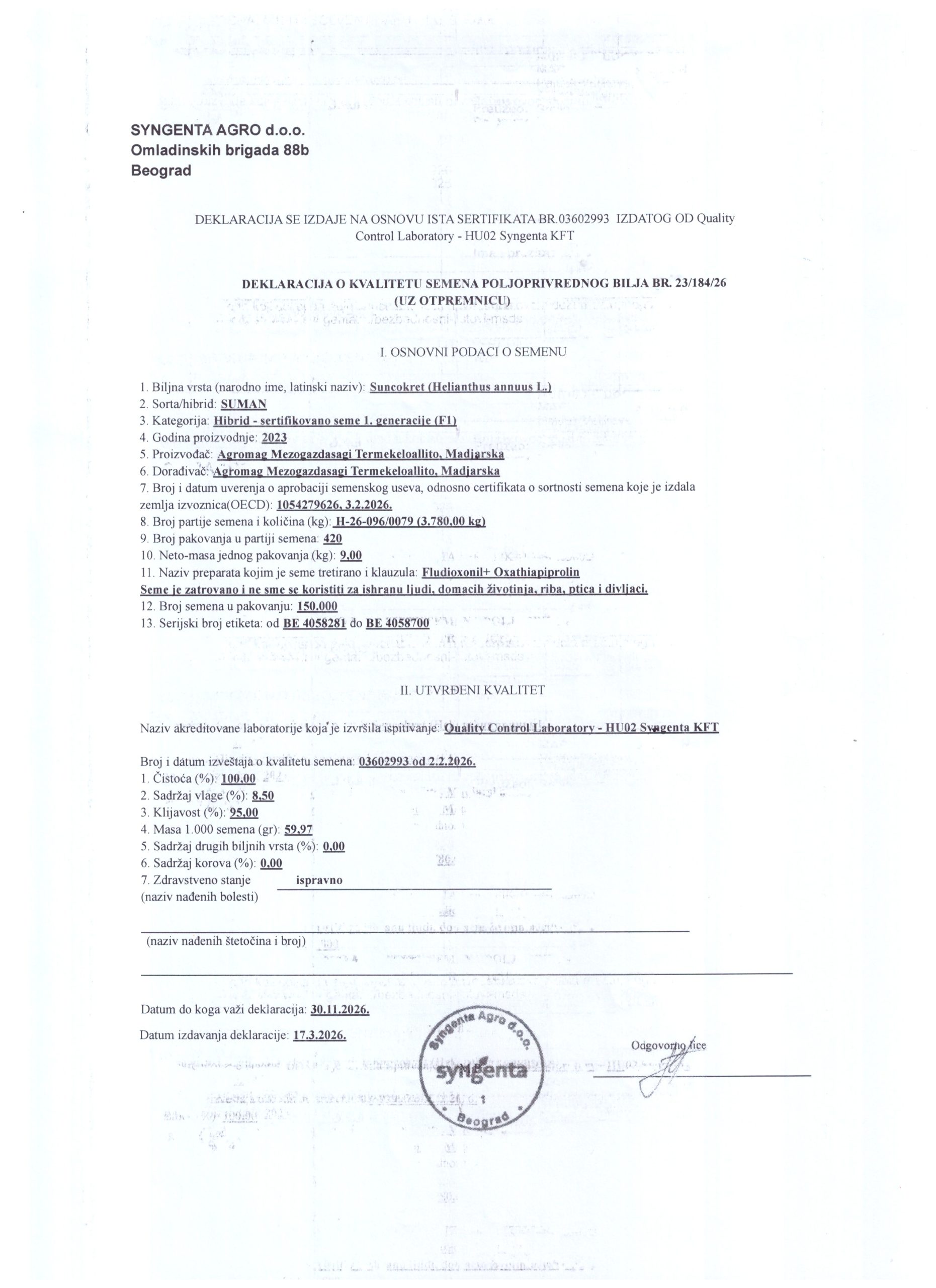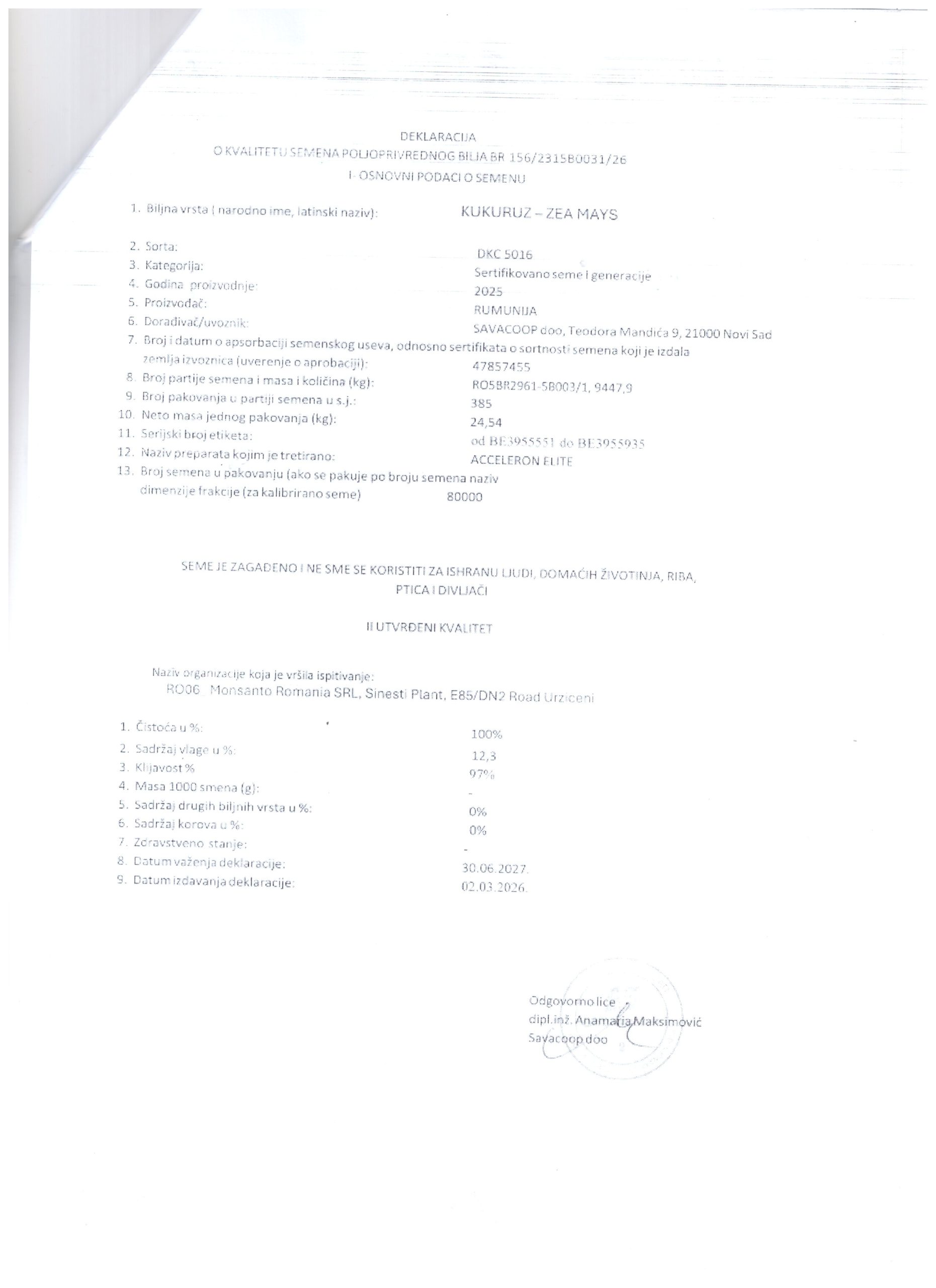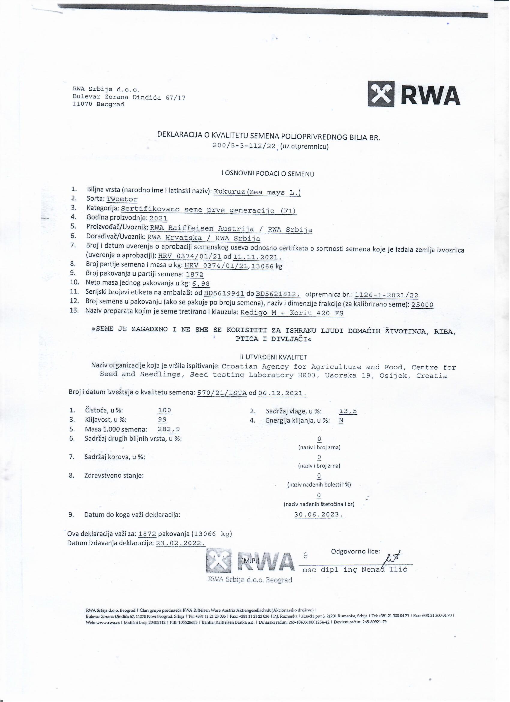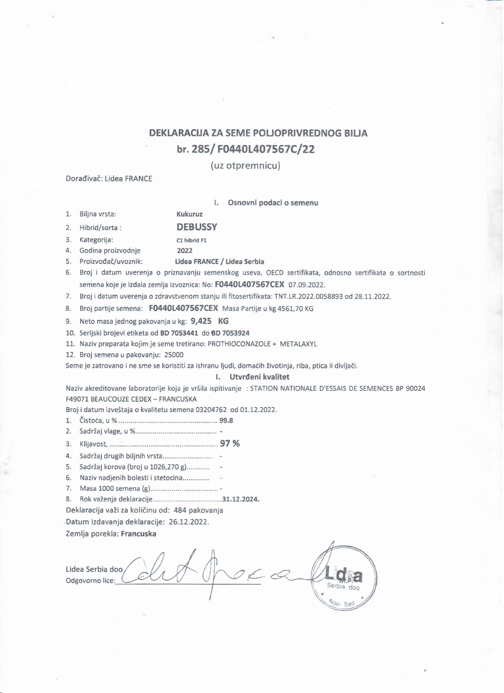 Uvoz i distribucija sredstava za zažštitu bilja kompanije NUFARM GmbH & Co KG, semena kukuruza i semena uljane repice kompanije MONSANTO INTERNATIONAL SARL.