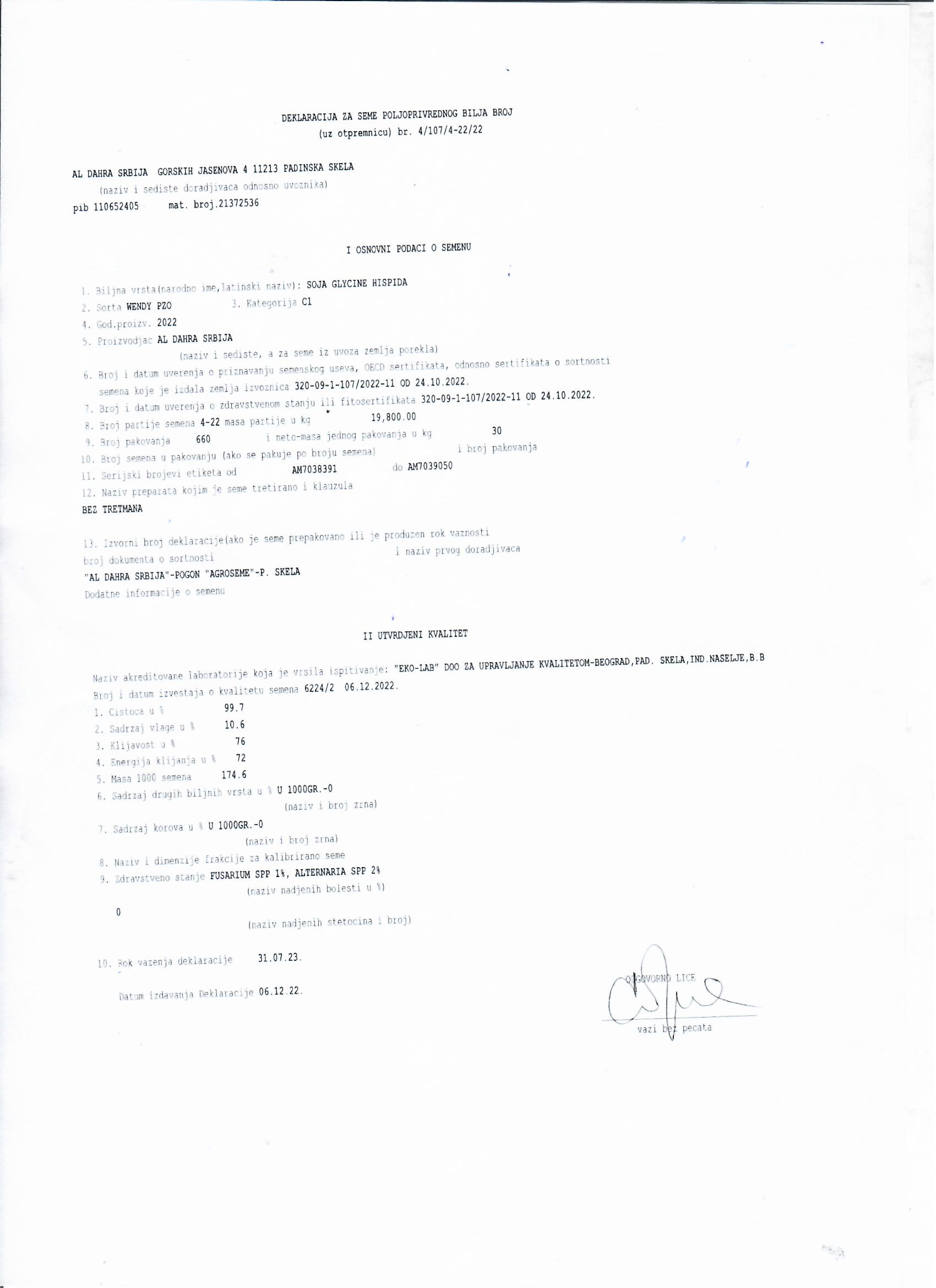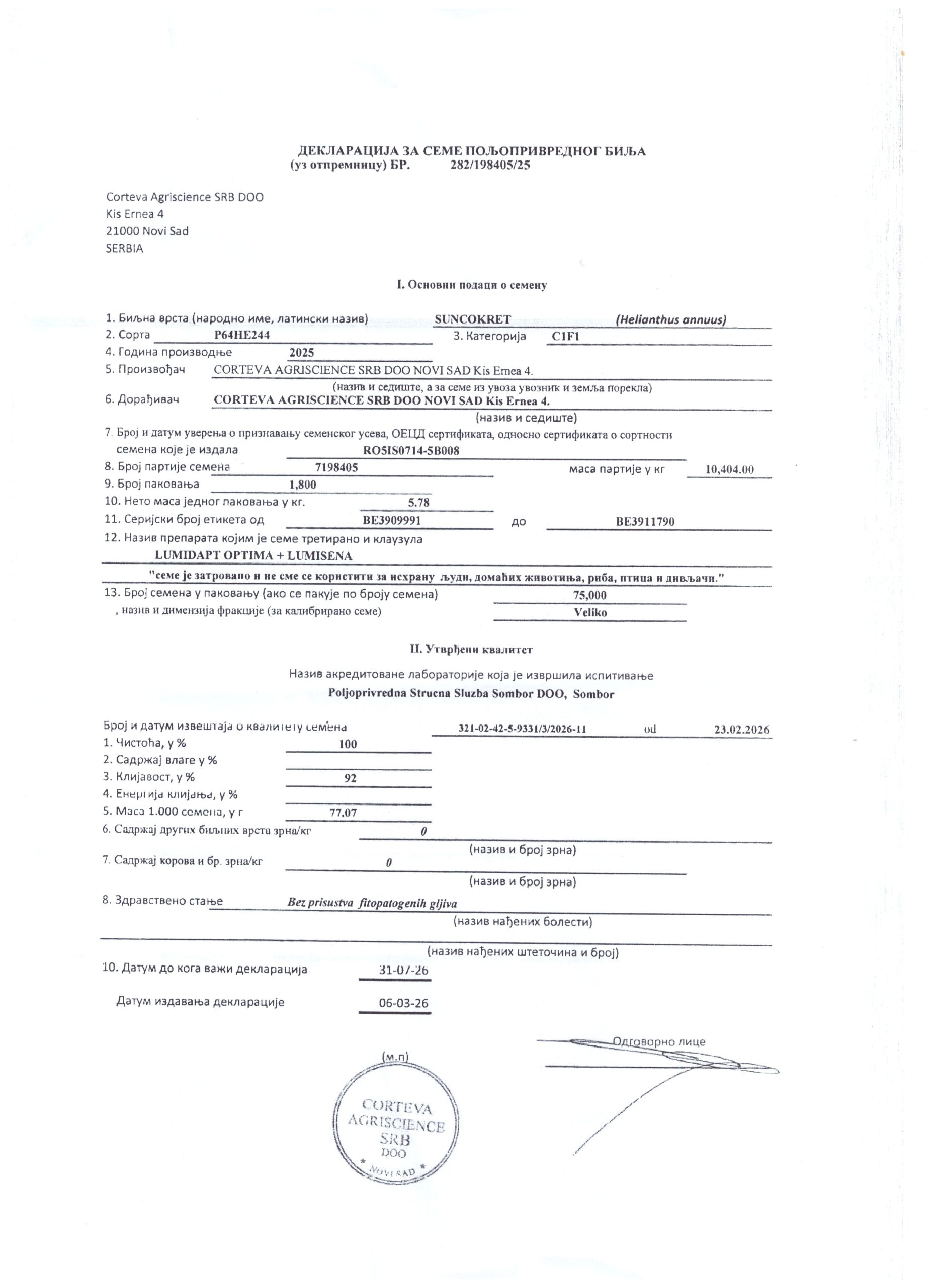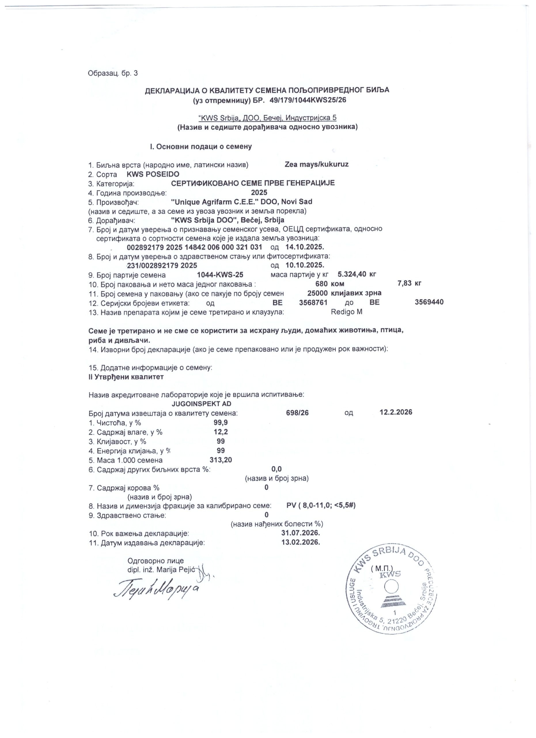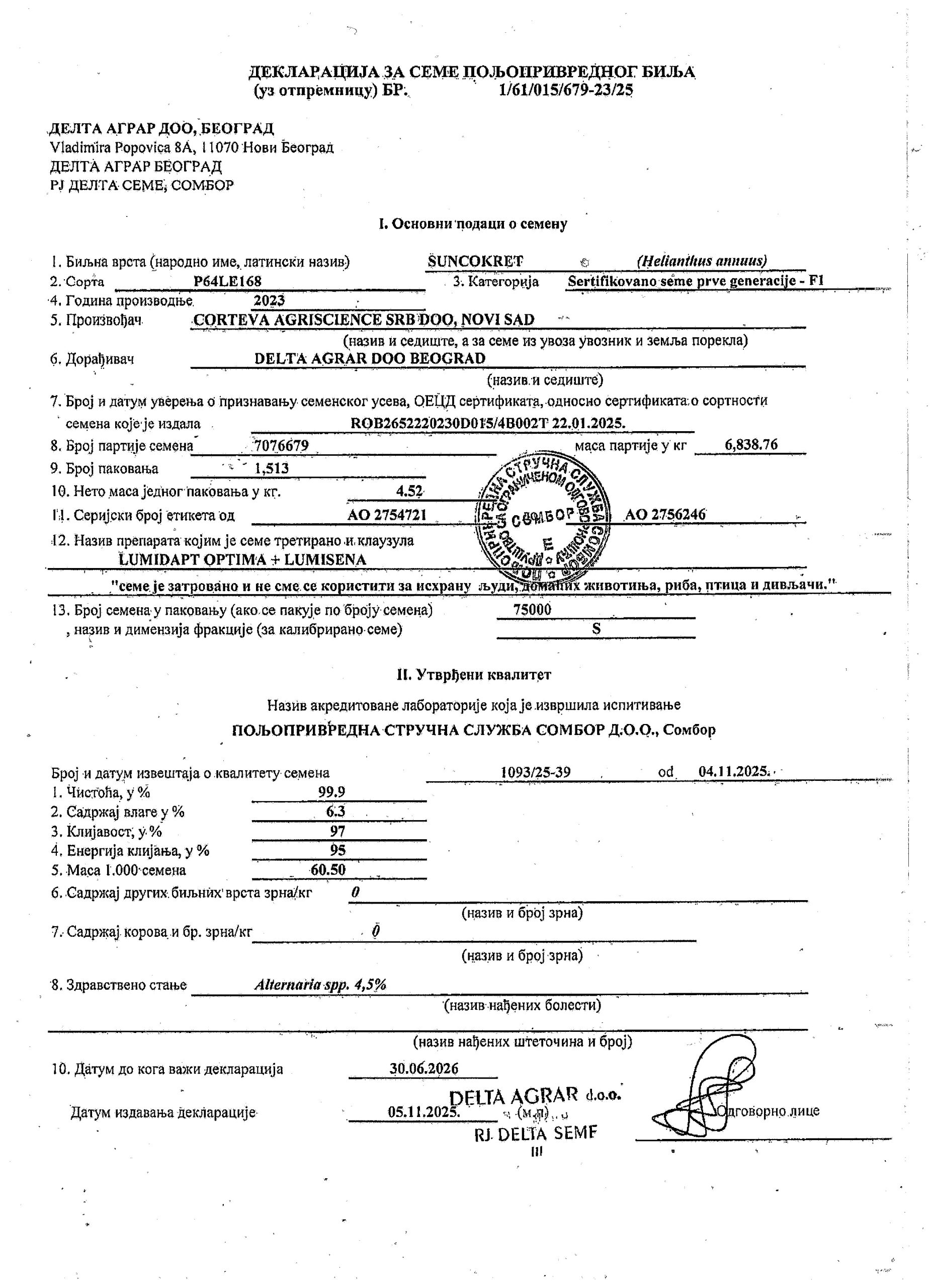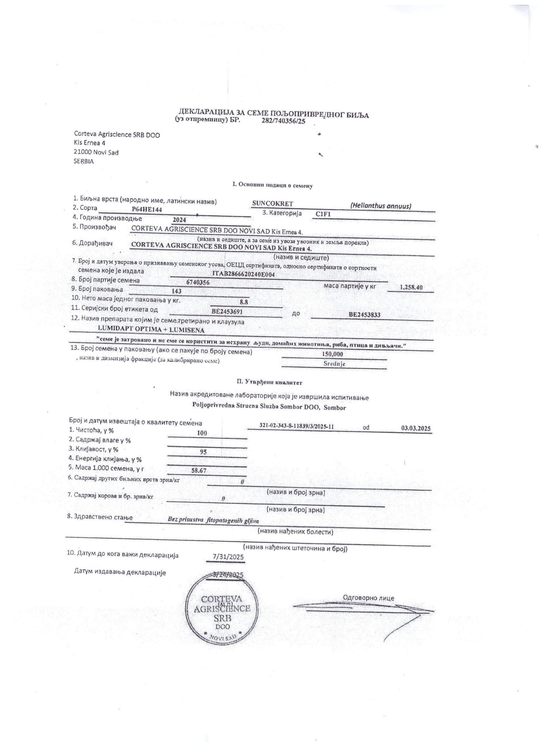 Uvoz i distribucija sredstava za zažštitu bilja kompanije NUFARM GmbH & Co KG, semena kukuruza i semena uljane repice kompanije MONSANTO INTERNATIONAL SARL.
