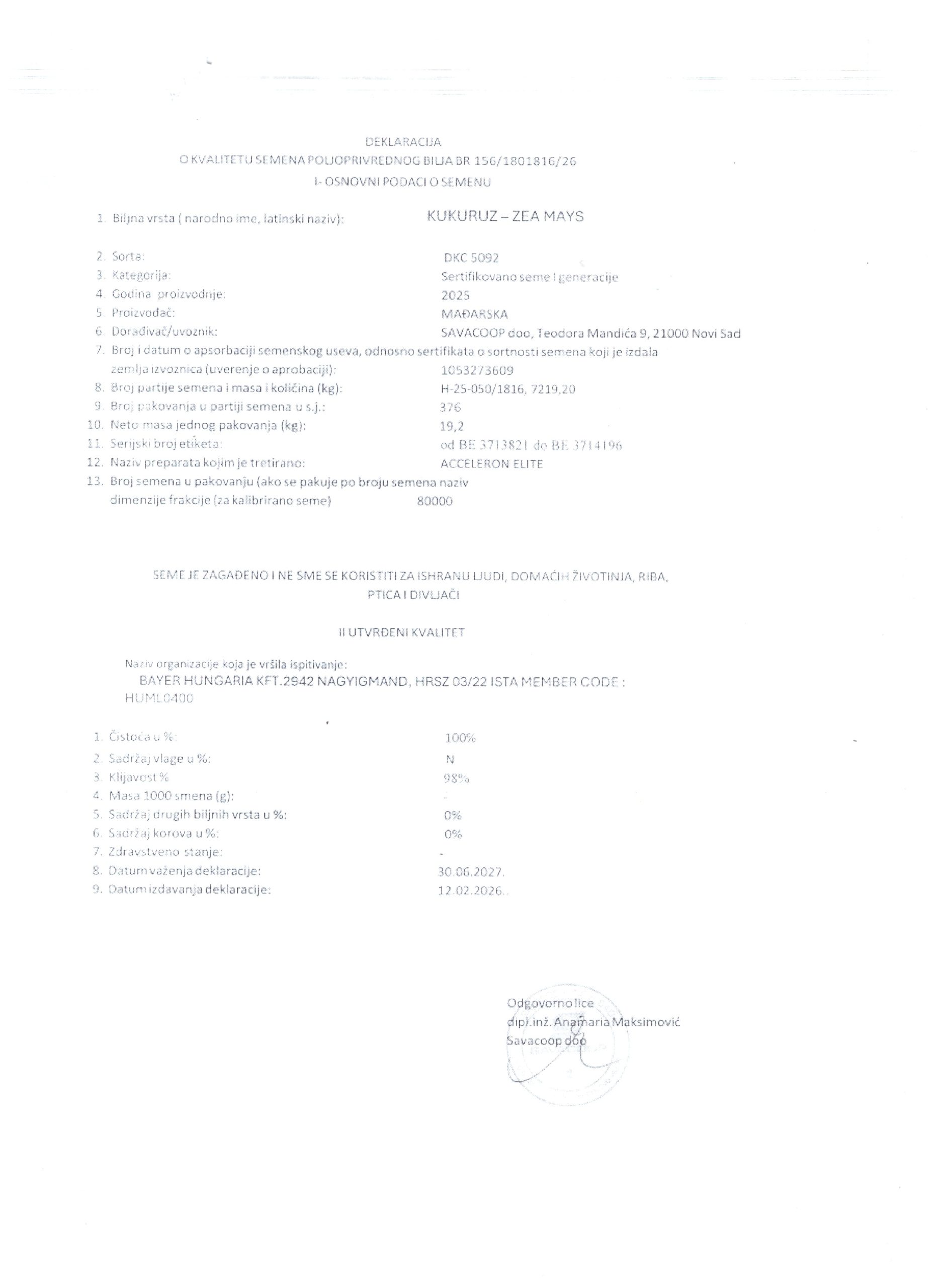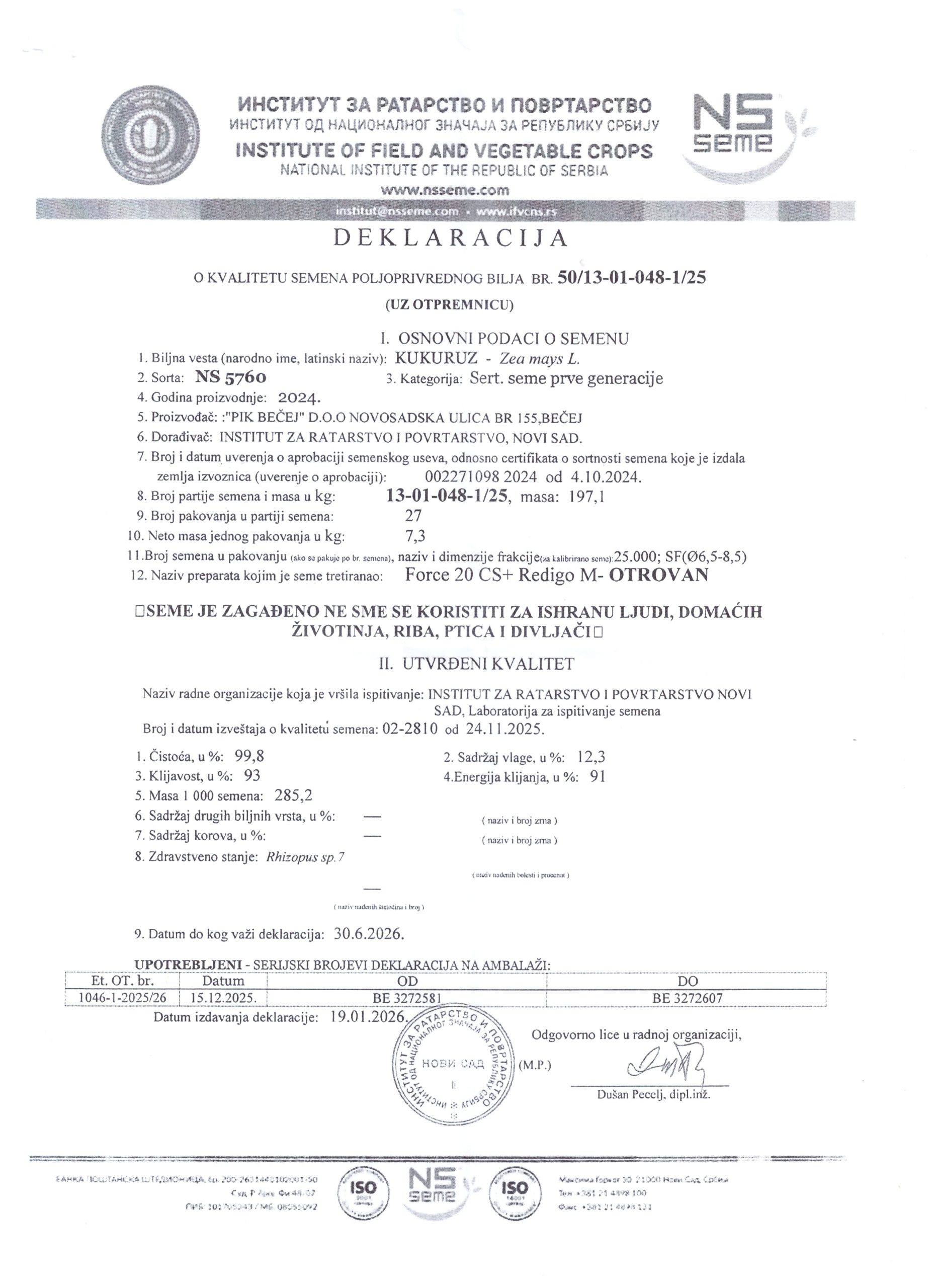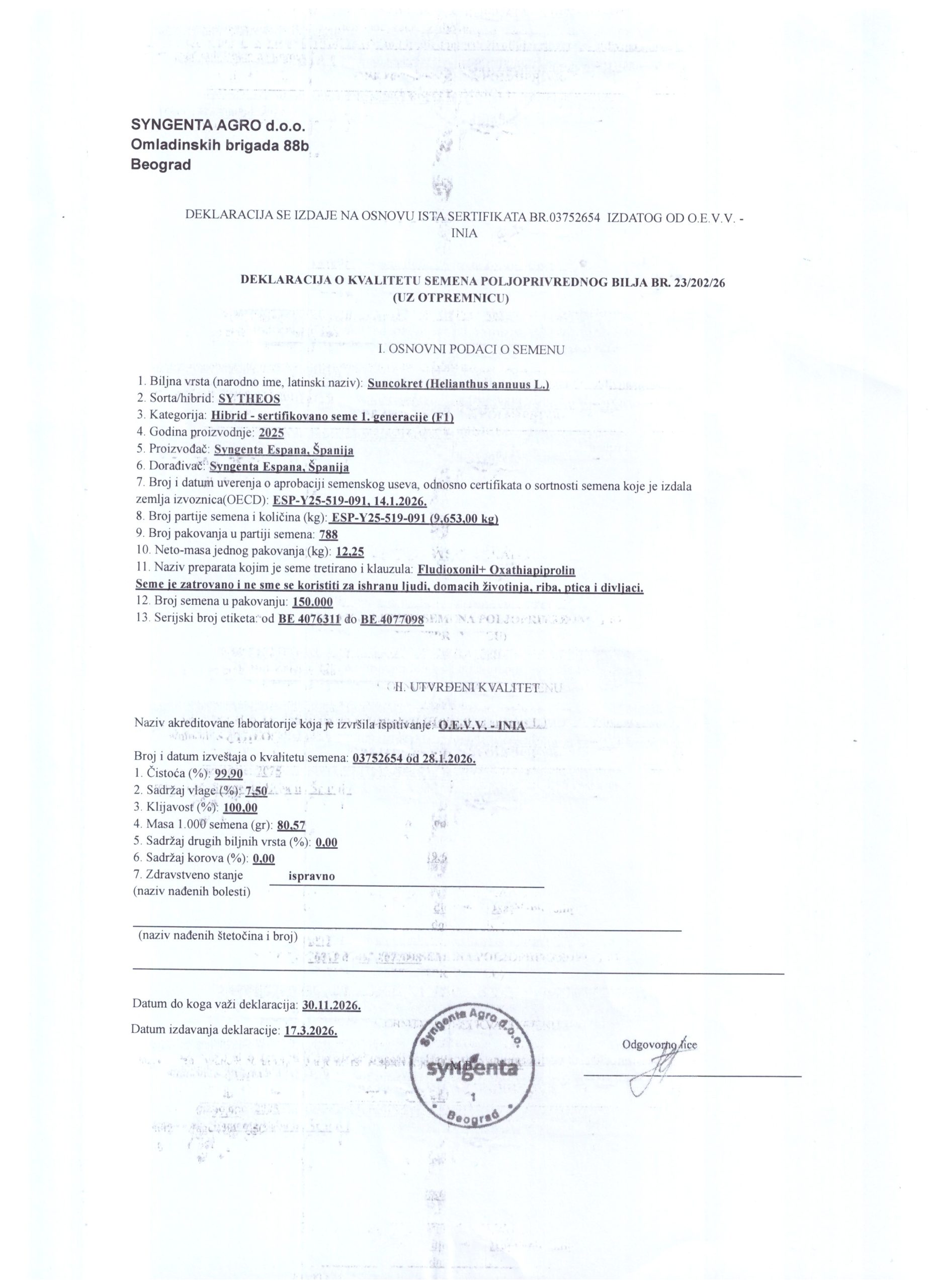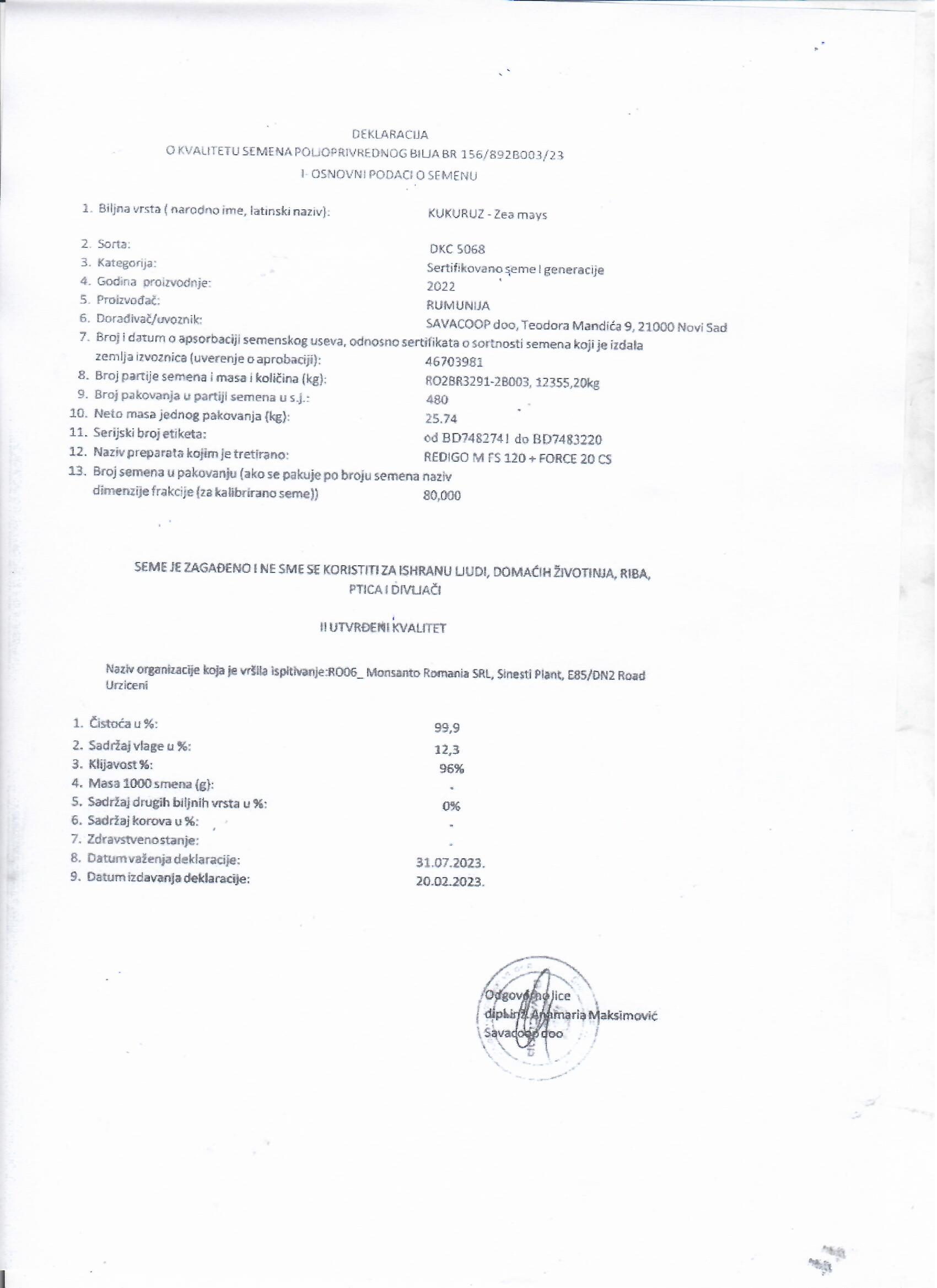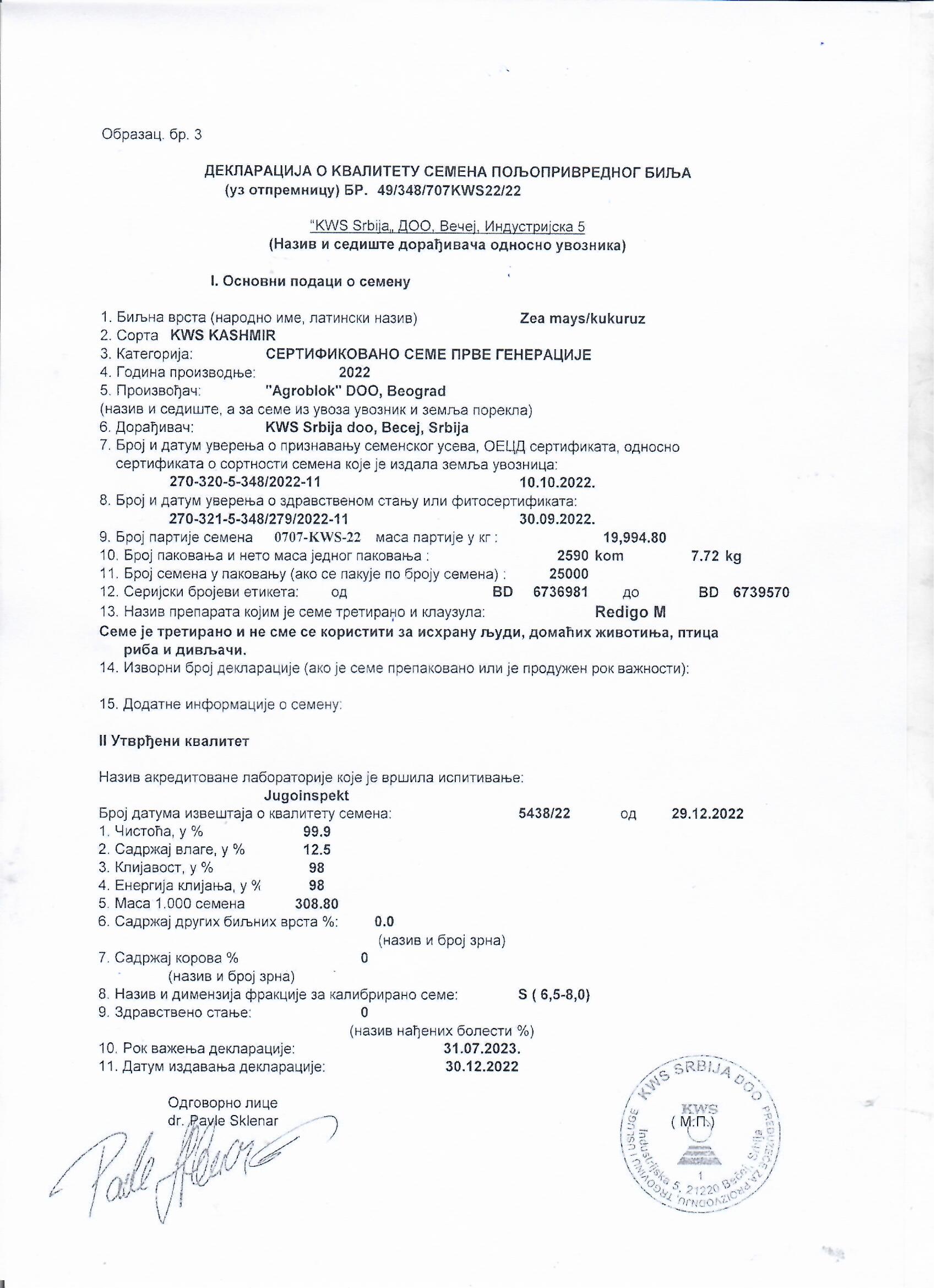 Uvoz i distribucija sredstava za zažštitu bilja kompanije NUFARM GmbH & Co KG, semena kukuruza i semena uljane repice kompanije MONSANTO INTERNATIONAL SARL.