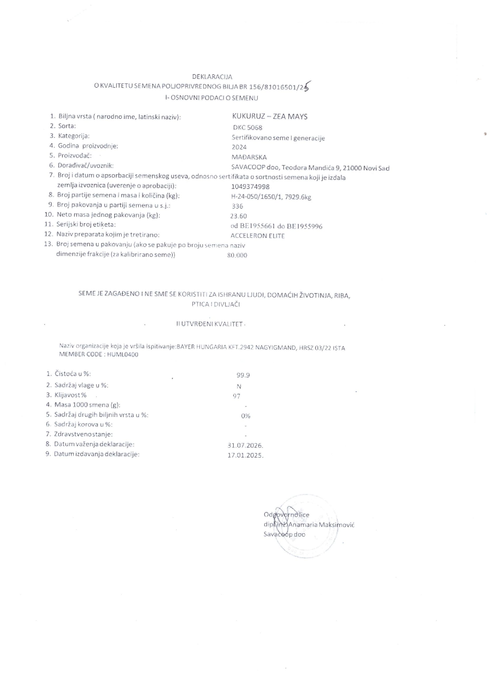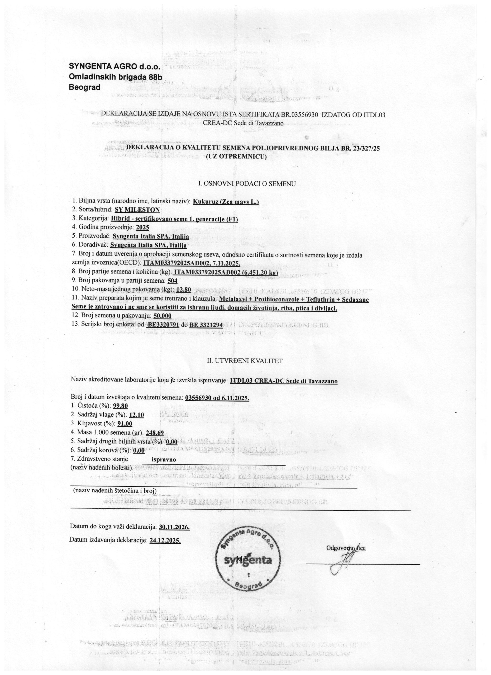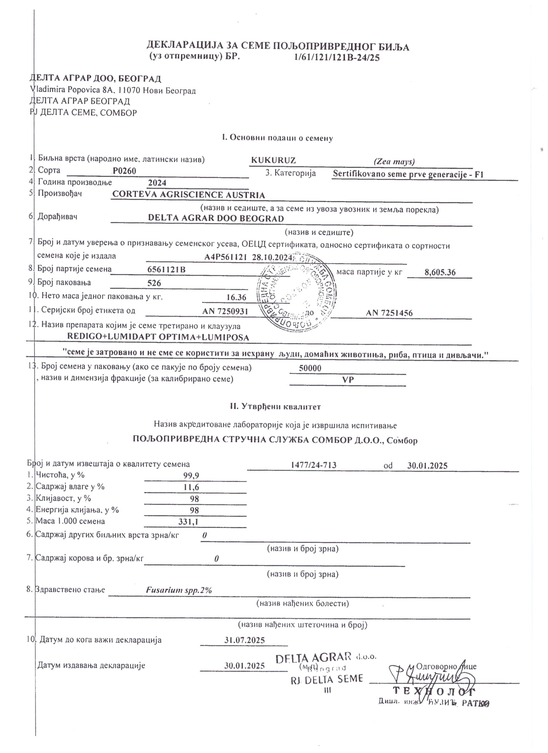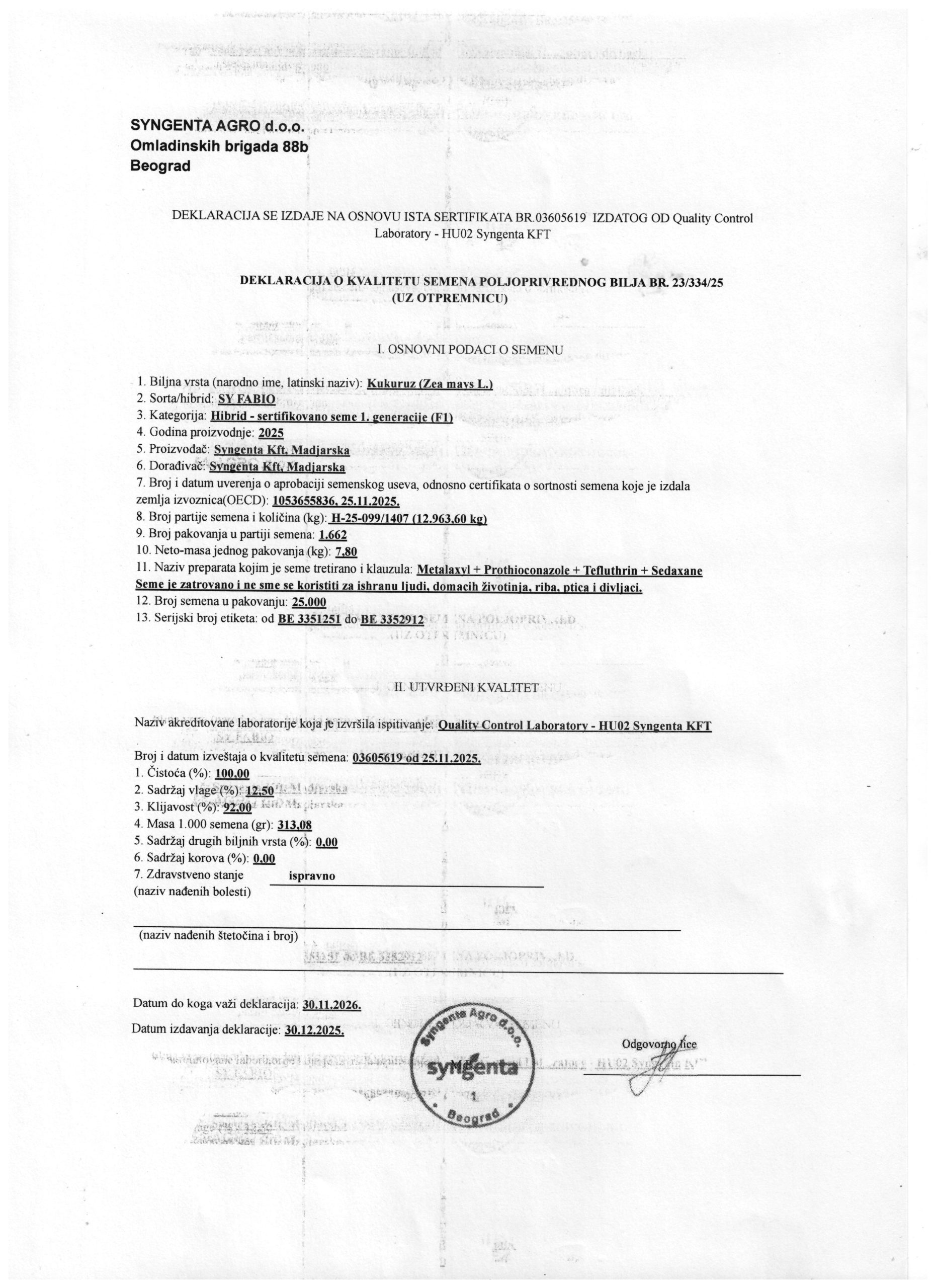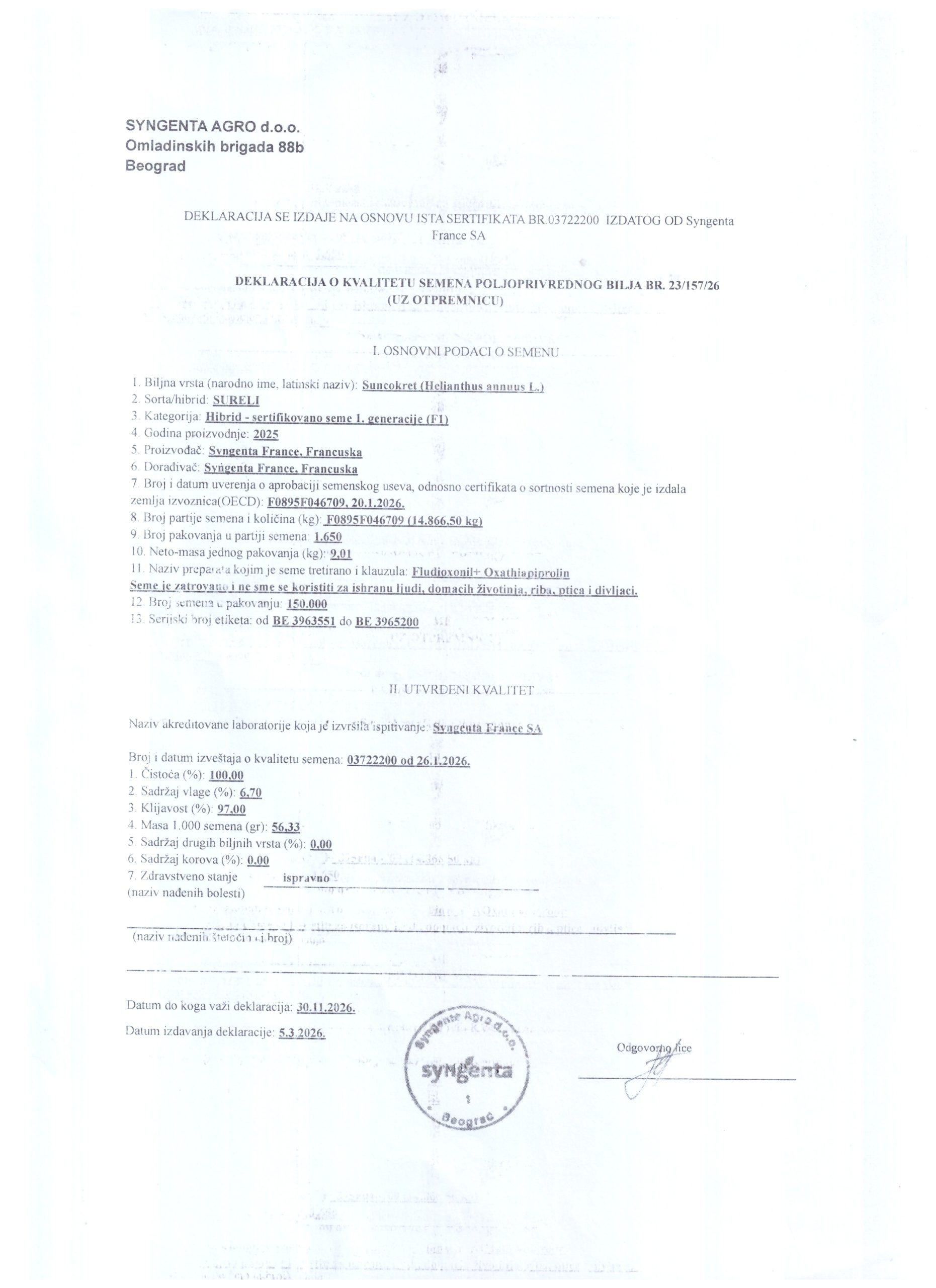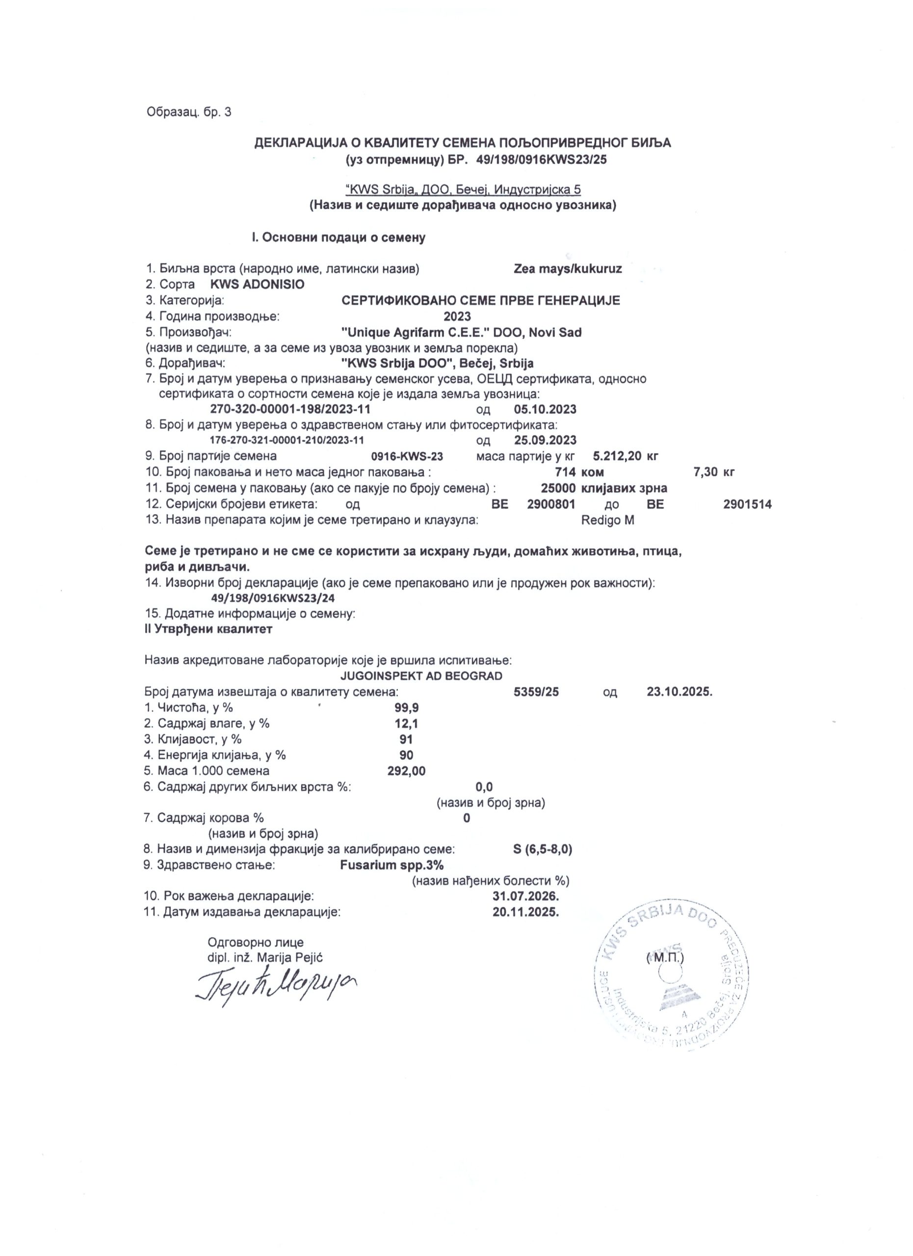 Uvoz i distribucija sredstava za zažštitu bilja kompanije NUFARM GmbH & Co KG, semena kukuruza i semena uljane repice kompanije MONSANTO INTERNATIONAL SARL.