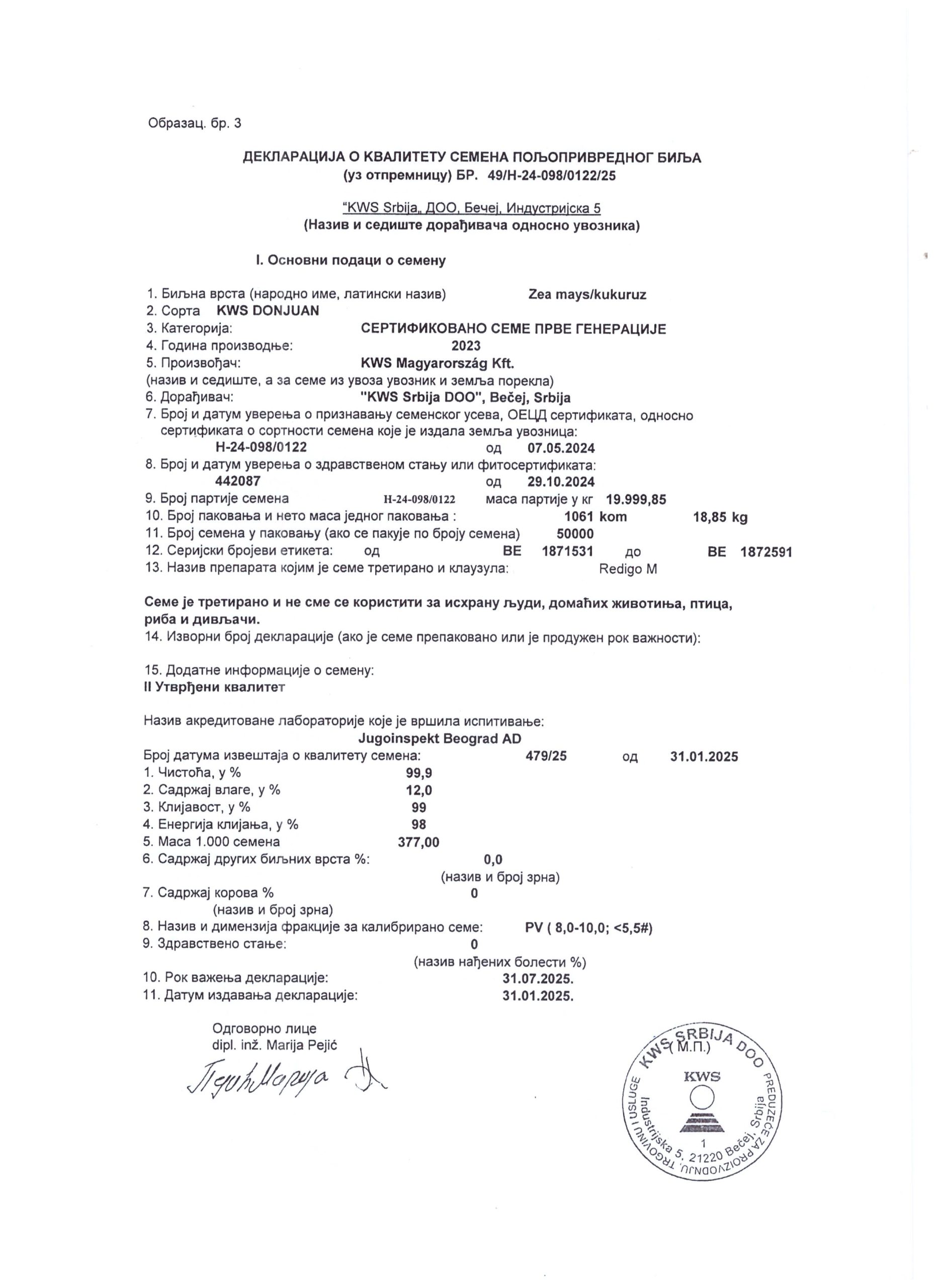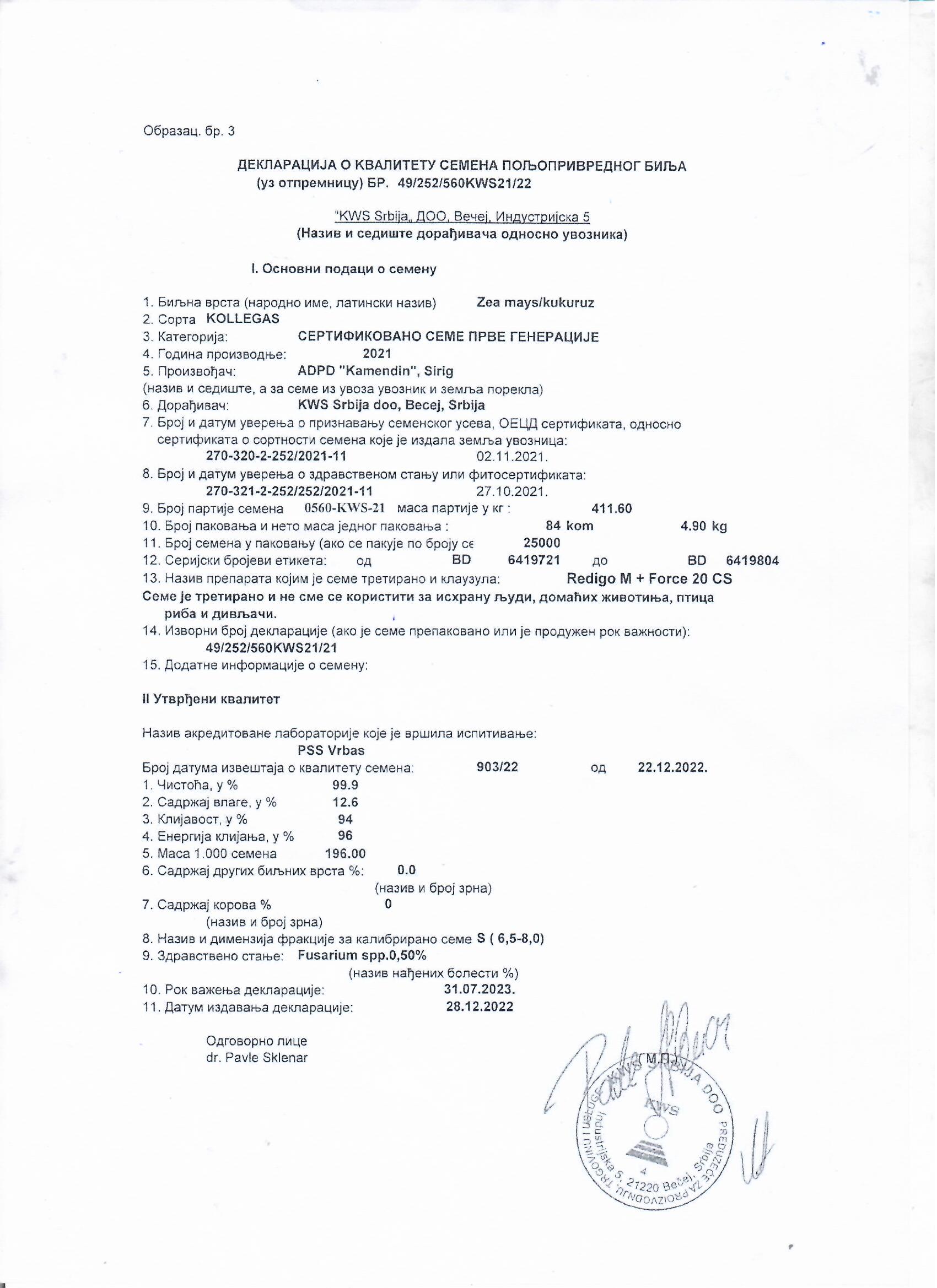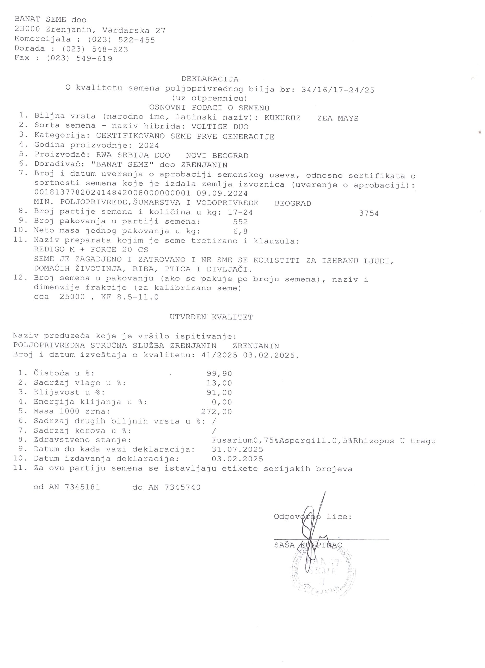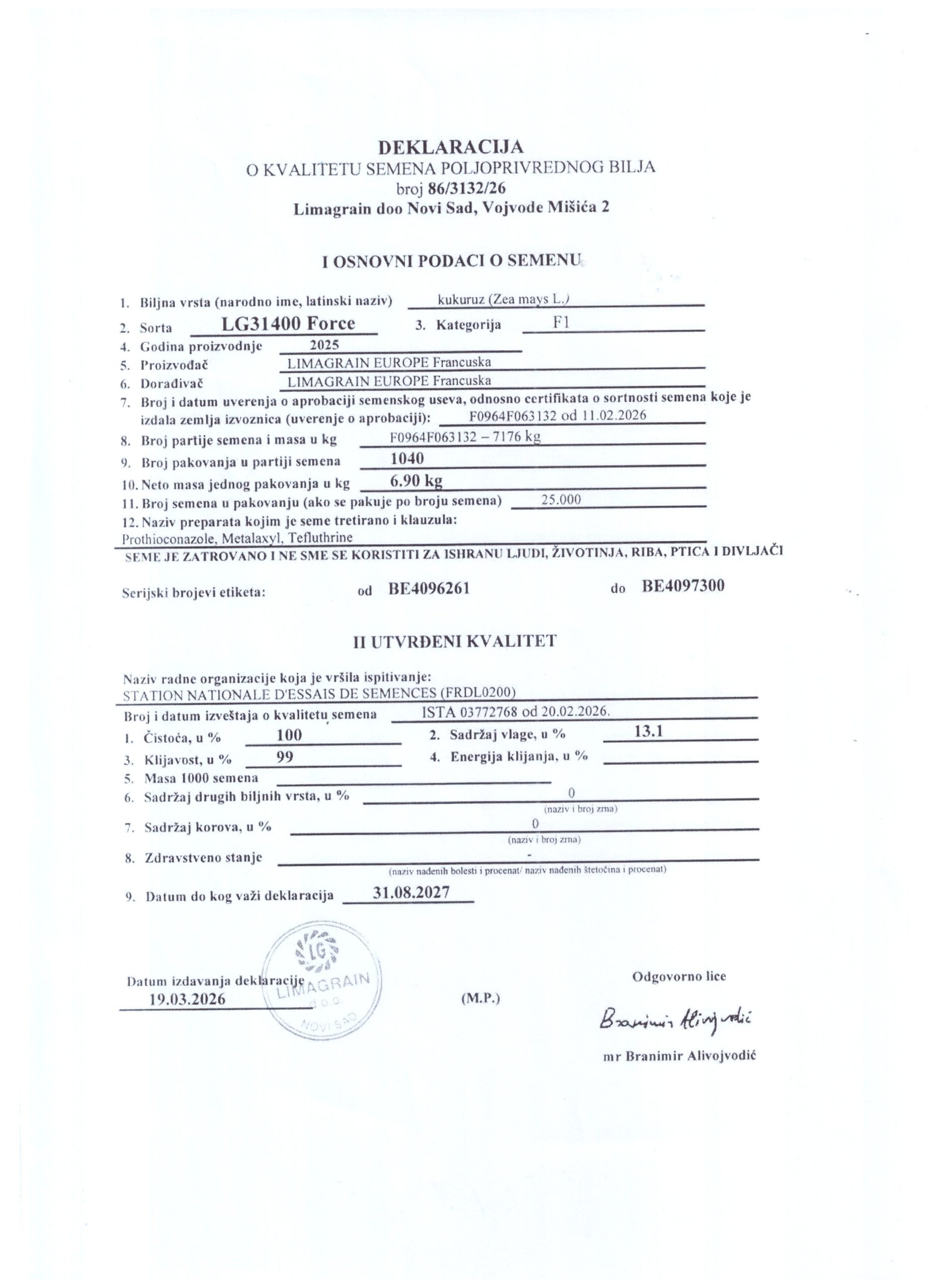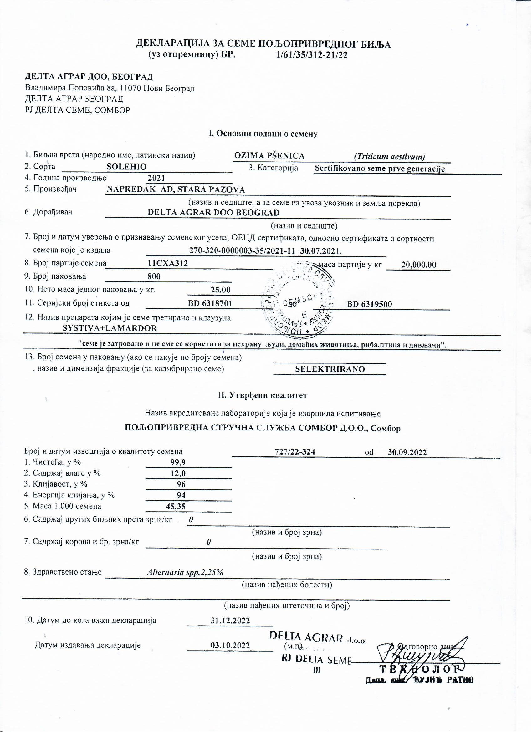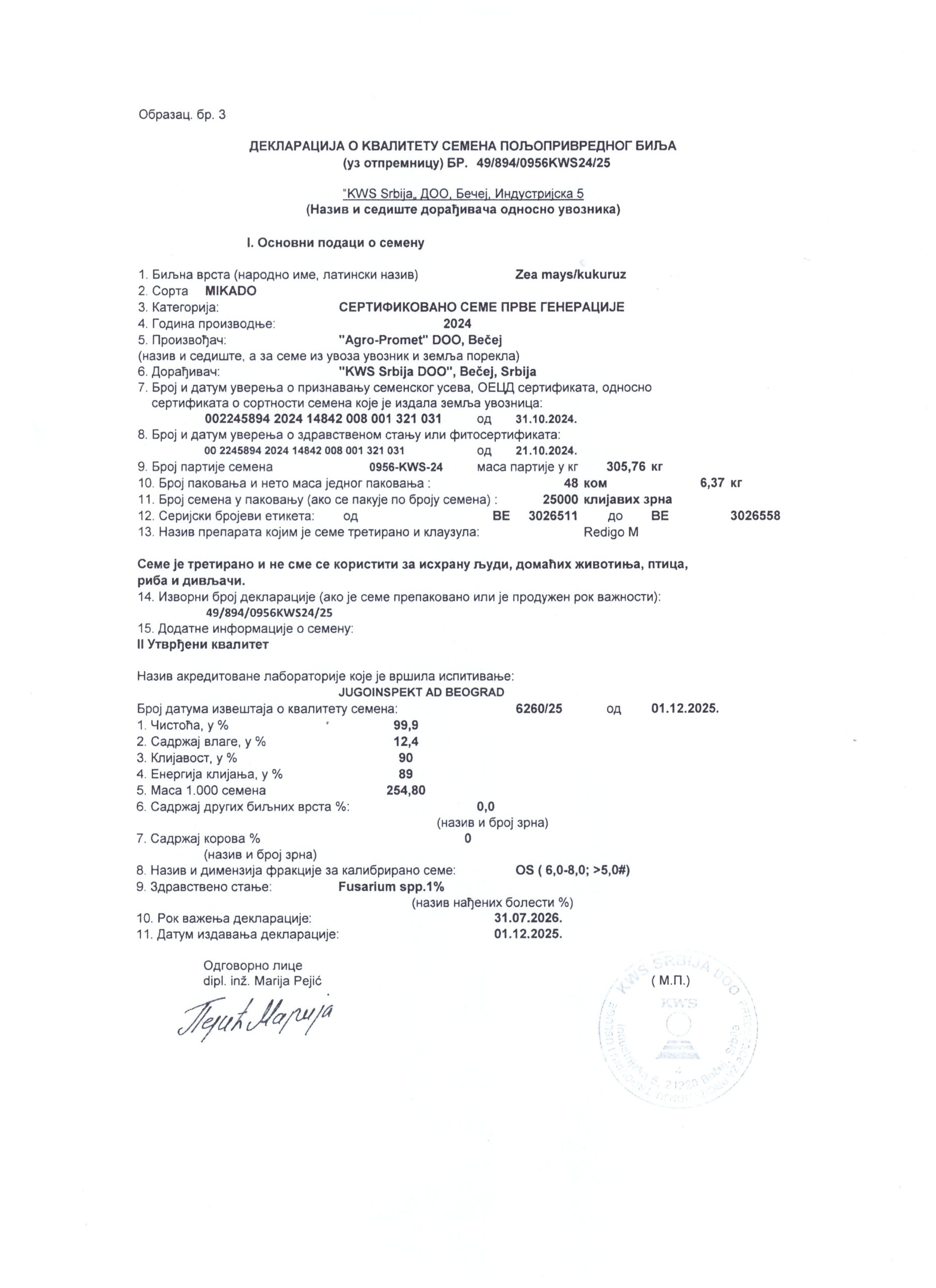 Uvoz i distribucija sredstava za zažštitu bilja kompanije NUFARM GmbH & Co KG, semena kukuruza i semena uljane repice kompanije MONSANTO INTERNATIONAL SARL.