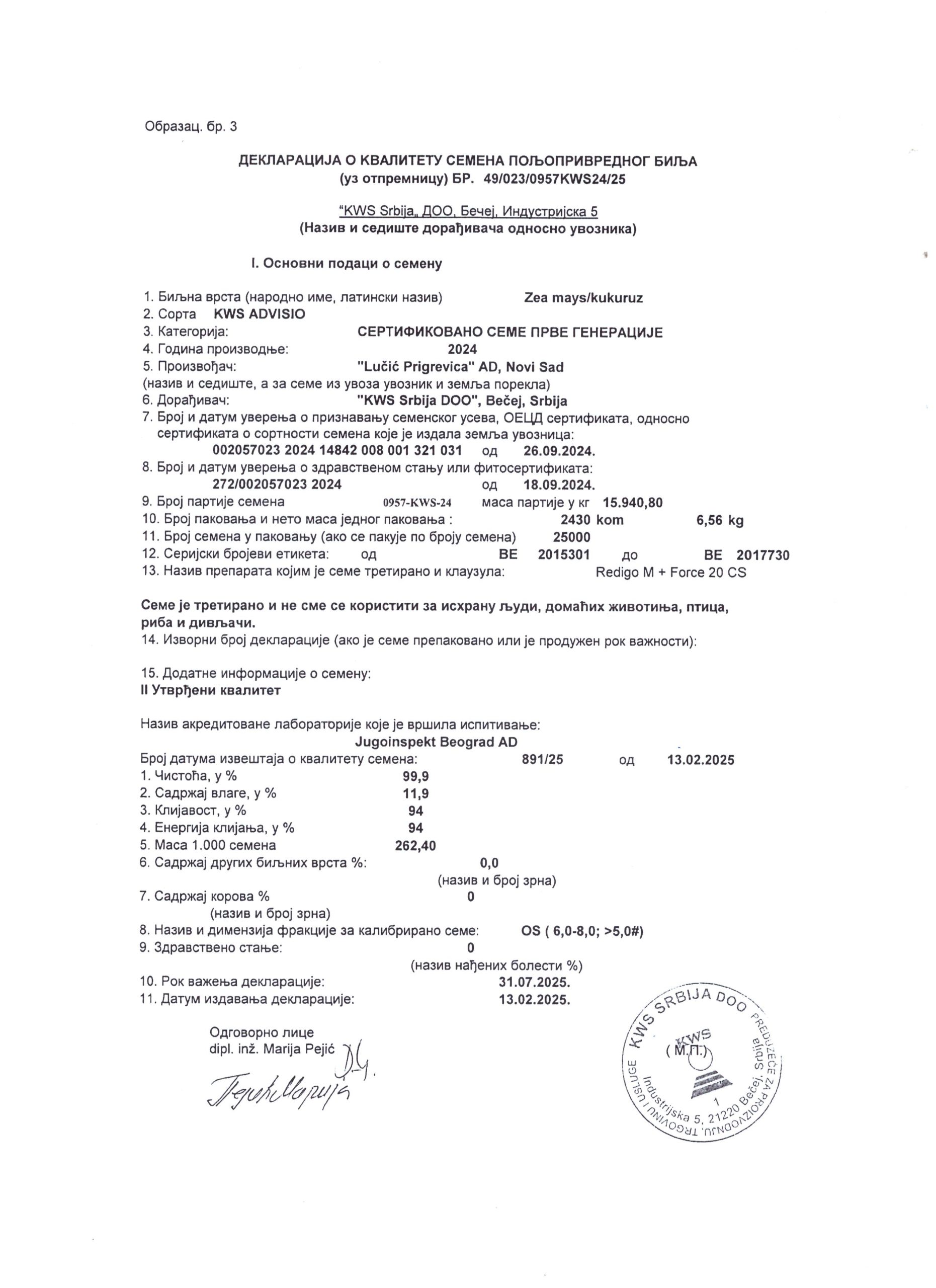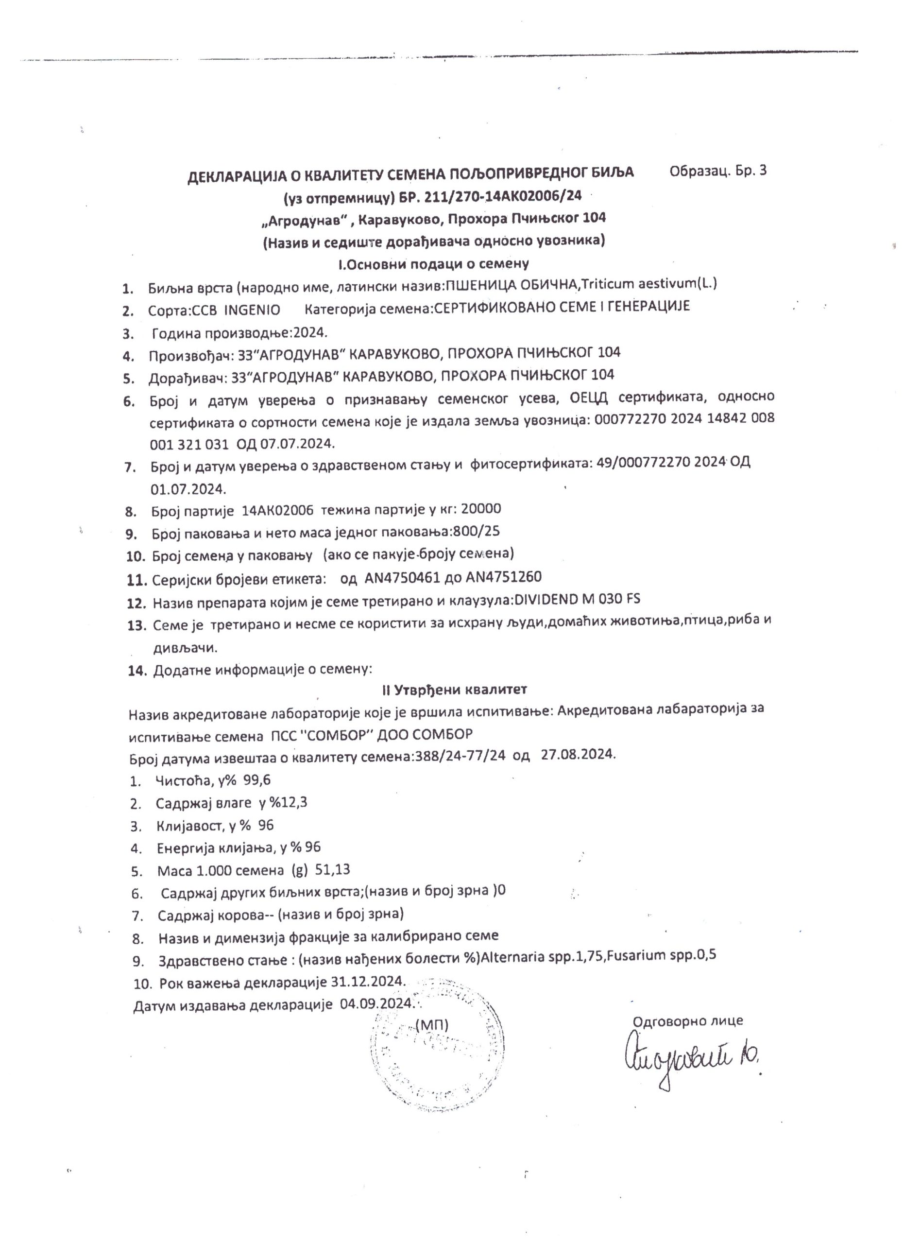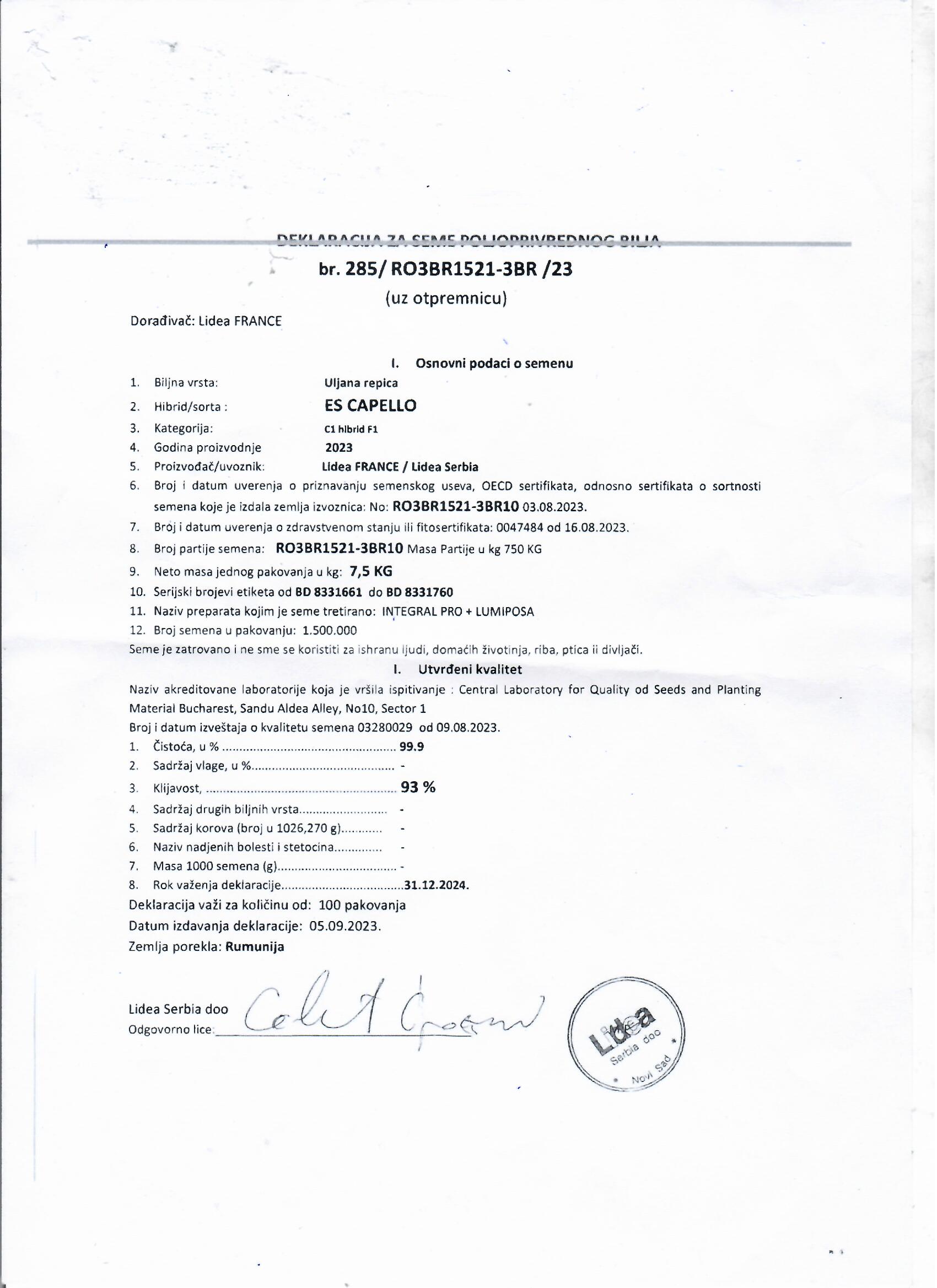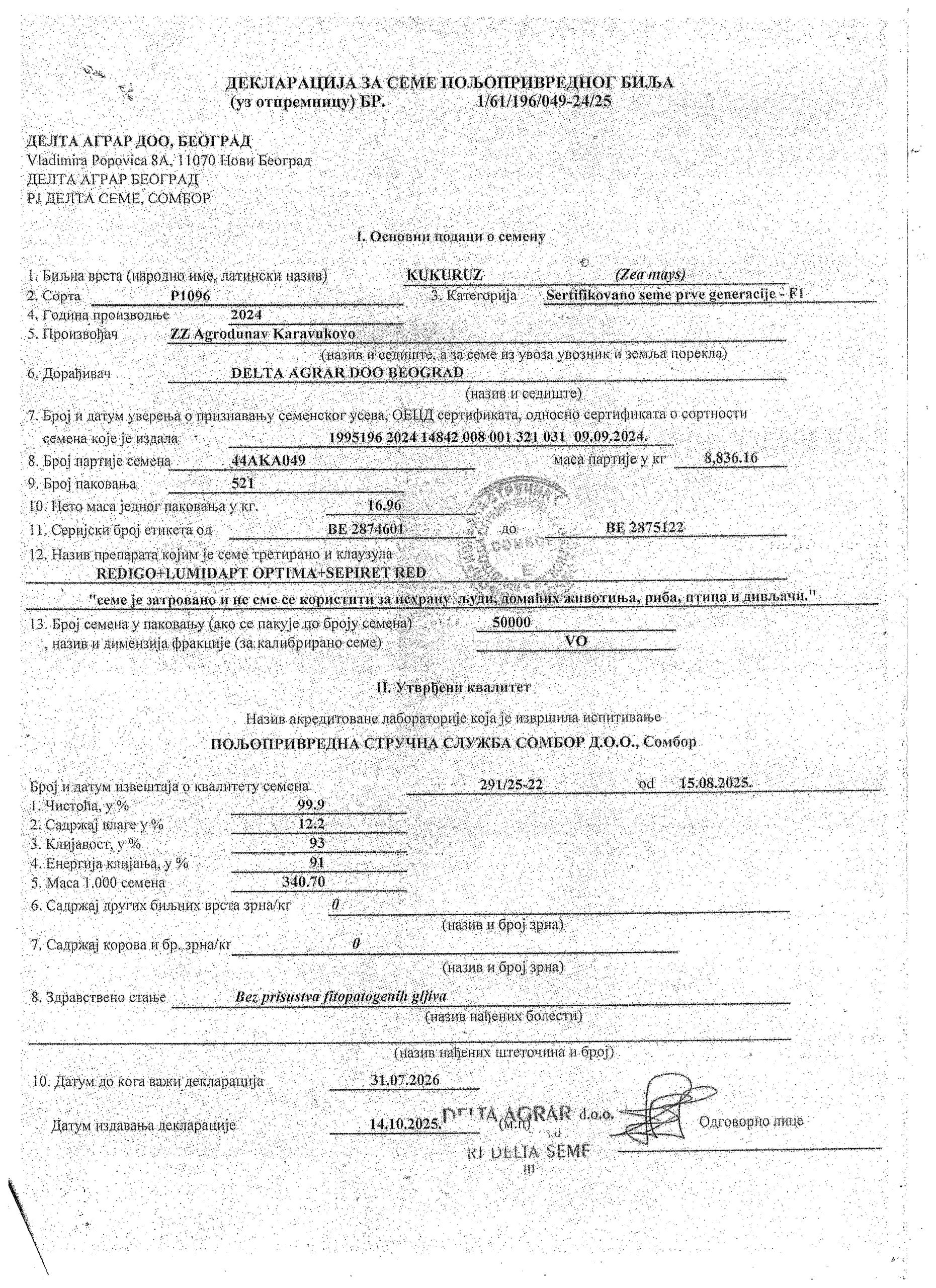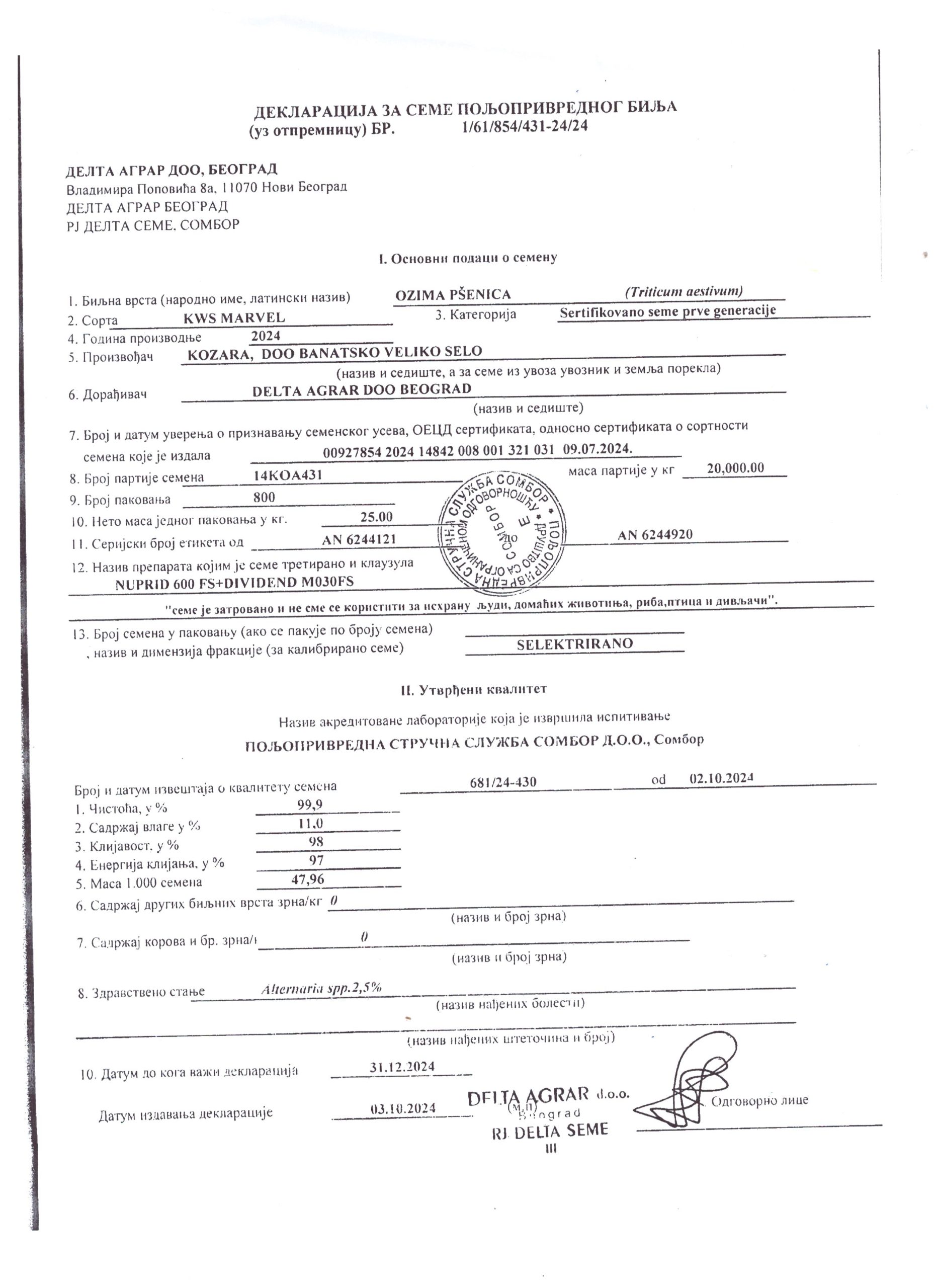 Uvoz i distribucija sredstava za zažštitu bilja kompanije NUFARM GmbH & Co KG, semena kukuruza i semena uljane repice kompanije MONSANTO INTERNATIONAL SARL.